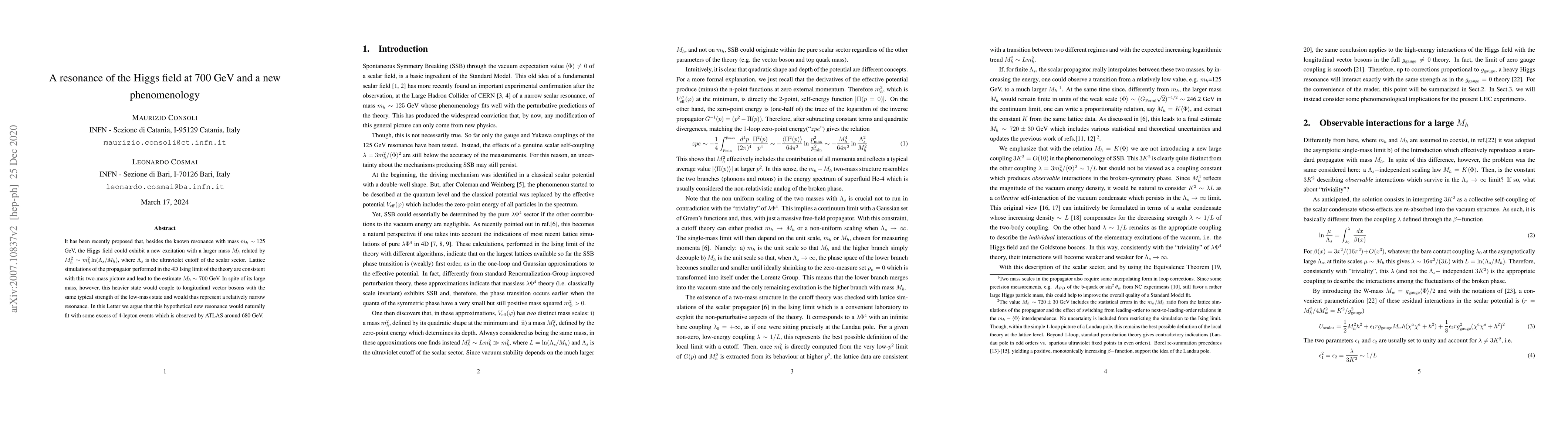 It has been recently proposed that, besides the known resonance with mass $m_h\sim$ 125 GeV, the Higgs field could exhibit a new excitation with a larger mass $M_h$ related by $M^2_h\sim m^2_h \ln (\Lambda_s/M_h)$, where $\Lambda_s$ is the ultraviolet cutoff of the scalar sector. Lattice simulations of the propagator performed in the 4D Ising limit of the theory are consistent with this two-mass picture and lead to the estimate $M_h\sim 700$ GeV. In spite of its large mass, however, this heavier state would couple to longitudinal vector bosons with the same typical strength of the low-mass state and would thus represent a relatively narrow resonance. In this Letter we argue that this hypothetical new resonance would naturally fit with some excess of 4-lepton events which is observed by ATLAS around 680 GeV.
