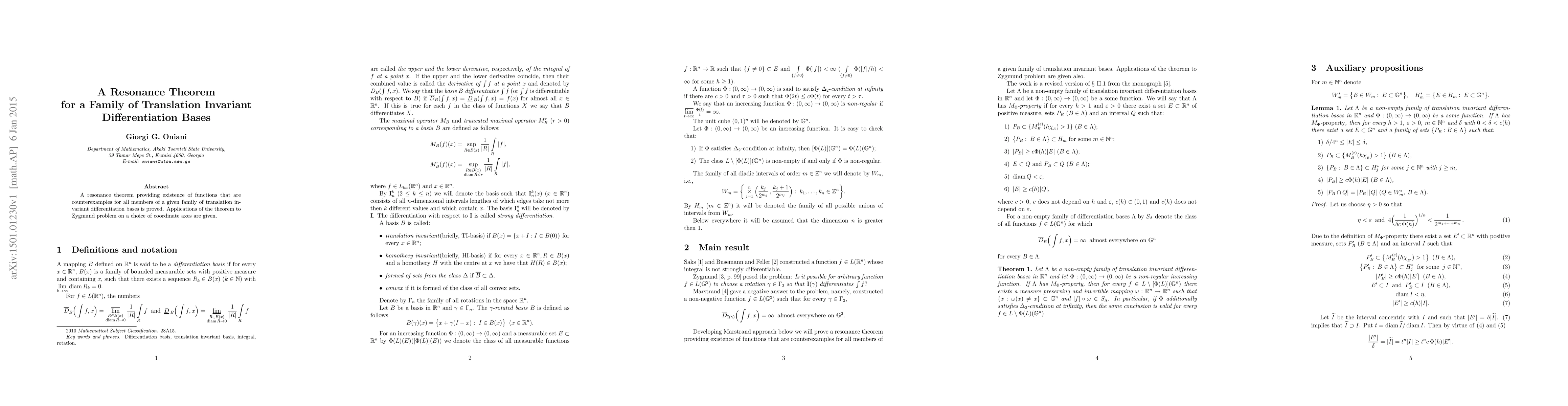 A resonance theorem proves existence of functions that counterexample a family of translation invariant differentiation bases, with applications to the Zygmund problem on coordinate axes.
