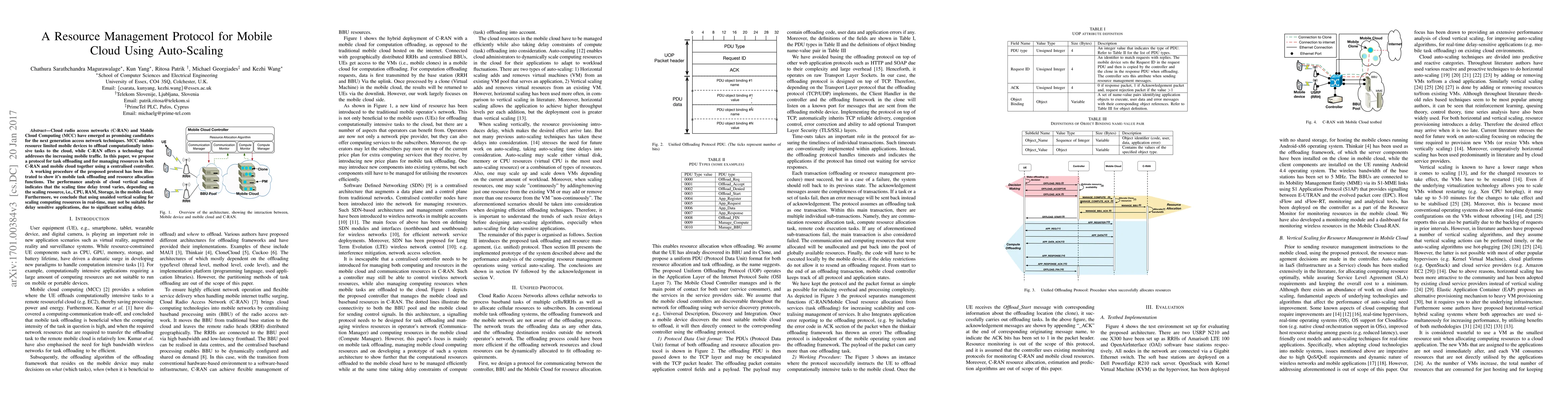 This paper proposes a protocol for managing resources in Cloud Radio Access Networks (C-RAN) and Mobile Cloud Computing (MCC) using a centralized controller and auto-scaling. Experimental results indicate that CPU, RAM, and storage scaling times vary, demonstrating the protocol's effectiveness in resource management.