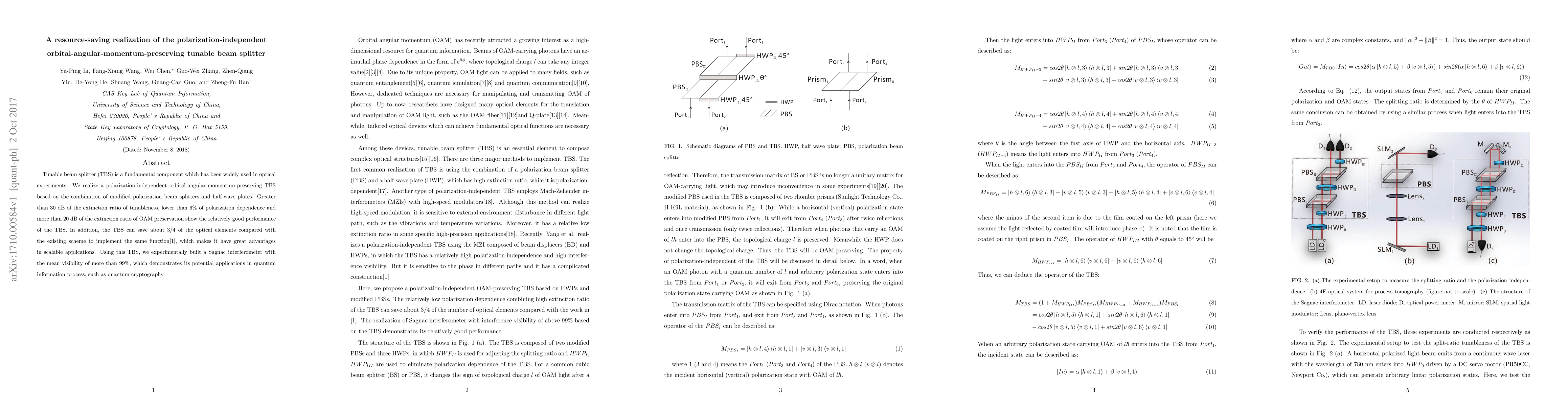 Tunable beam splitter (TBS) is a fundamental component which has been widely used in optical experiments. We realize a polarization-independent orbital-angular-momentum-preserving TBS based on the combination of modified polarization beam splitters and half-wave plates. Greater than 30 dB of the extinction ratio of tunableness, lower than $6\%$ of polarization dependence and more than 20 dB of the extinction ratio of OAM preservation show the relatively good performance of the TBS. In addition, the TBS can save about 3/4 of the optical elements compared with the existing scheme to implement the same function\cite{yang2016experimental}, which makes it have great advantages in scalable applications. Using this TBS, we experimentally built a Sagnac interferometer with the mean visibility of more than $99\%$, which demonstrates its potential applications in quantum information process, such as quantum cryptography.