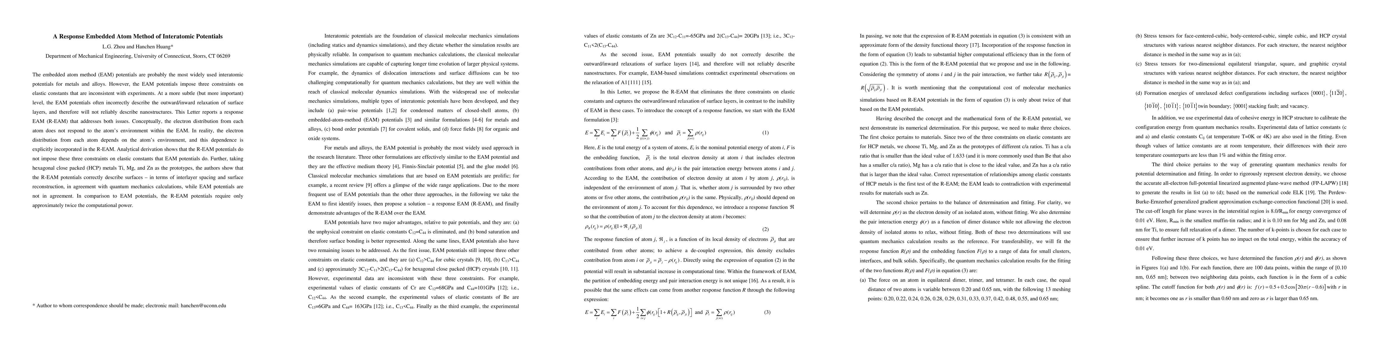 The embedded atom method (EAM) potentials are probably the most widely used interatomic potentials for metals and alloys. However, the EAM potentials impose three constraints on elastic constants that are inconsistent with experiments. At a more subtle (but more important) level, the EAM potentials often incorrectly describe the outward/inward relaxation of surface layers, and therefore will not reliably describe nanostructures. This Letter reports a response EAM (R-EAM) that addresses both issues. Conceptually, the electron distribution from each atom does not respond to the atoms environment within the EAM. In reality, the electron distribution from each atom depends on the atoms environment, and this dependence is explicitly incorporated in the R-EAM. Analytical derivation shows that the R-EAM potentials do not impose these three constraints on elastic constants that EAM potentials do. Further, taking hexagonal close packed (HCP) metals Ti, Mg, and Zn as the prototypes, the authors show that the R-EAM potentials correctly describe surfaces, in terms of interlayer spacing and surface reconstruction, in agreement with quantum mechanics calculations, while EAM potentials are not in agreement. In comparison to EAM potentials, the R-EAM potentials require only approximately twice the computational power.