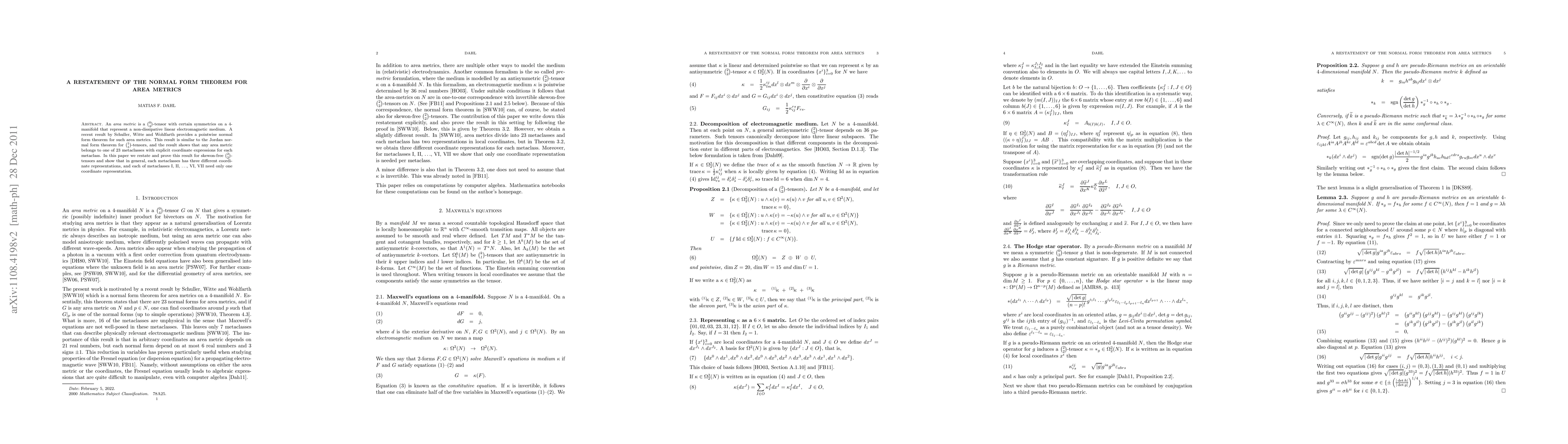 Researchers restate and extend a theorem that classifies area metrics in 4-manifolds into 23 metaclasses with explicit coordinate expressions, revealing new insights into the symmetries of these tensors.