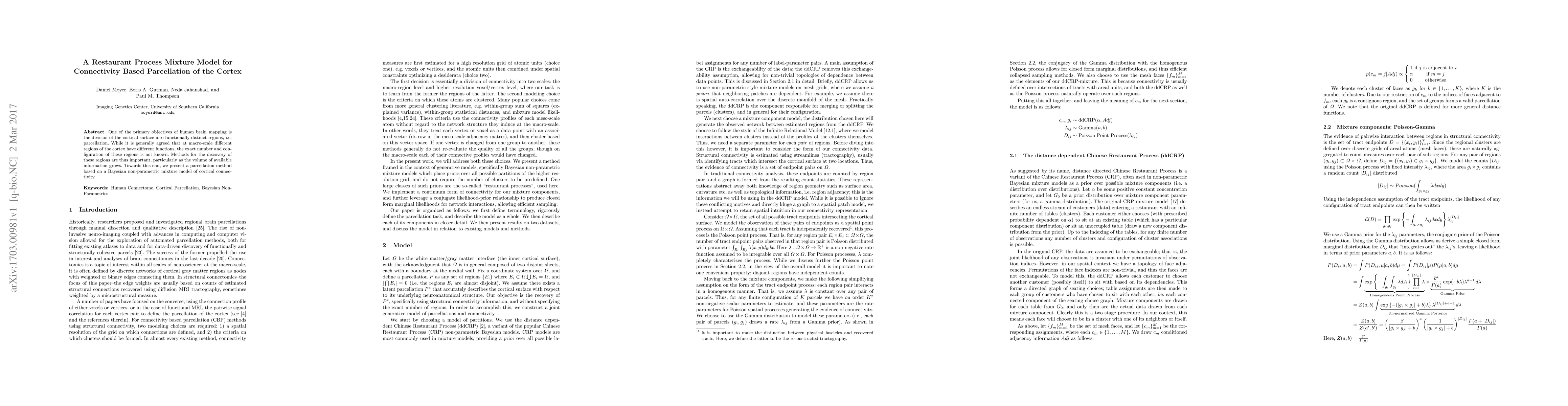 This paper proposes a Bayesian non-parametric mixture model, inspired by restaurant processes, to parcellate the cortex into functionally distinct regions based on cortical connectivity. The method aims to discover the unknown number and configuration of macro-scale functional regions in the brain as data volumes increase.