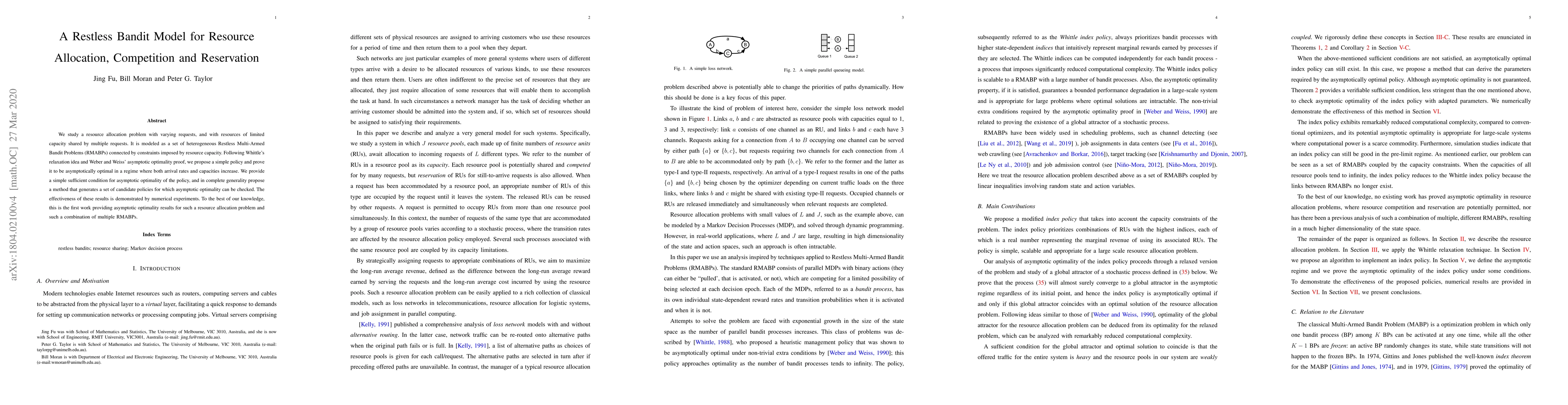 This paper introduces a Restless Bandit Model for resource allocation among competing requests with limited capacity. It proposes an asymptotically optimal policy for this problem and demonstrates its effectiveness through numerical experiments, marking the first such work to achieve asymptotic optimality for a combination of multiple Restless Multi-Armed Bandit Problems under resource constraints.