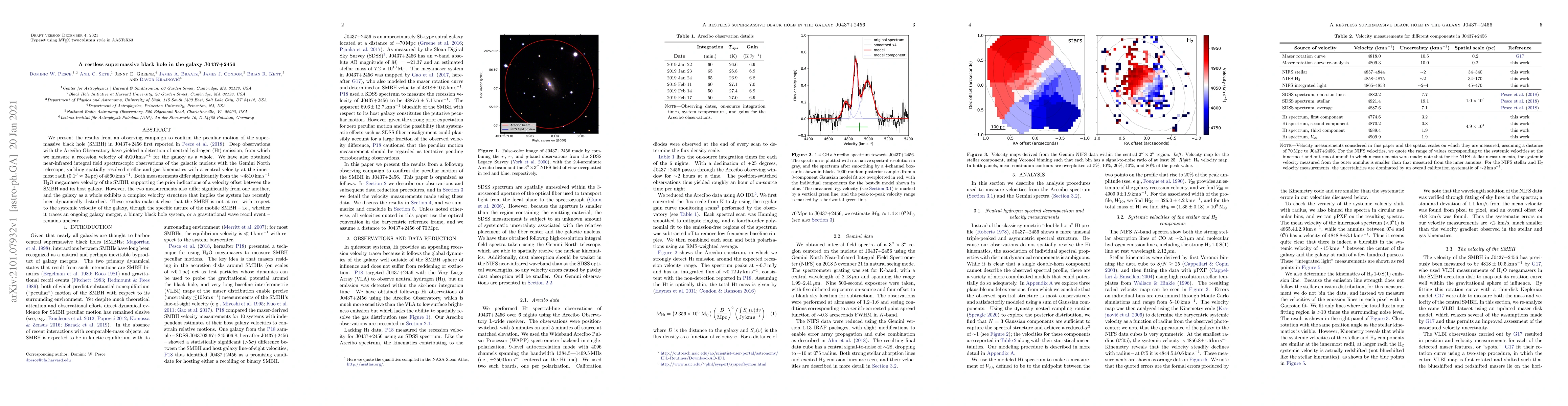We present the results from an observing campaign to confirm the peculiar motion of the supermassive black hole (SMBH) in J0437+2456 first reported in Pesce et al. (2018). Deep observations with the Arecibo Observatory have yielded a detection of neutral hydrogen (HI) emission, from which we measure a recession velocity of 4910 km s$^{-1}$ for the galaxy as a whole. We have also obtained near-infrared integral field spectroscopic observations of the galactic nucleus with the Gemini North telescope, yielding spatially resolved stellar and gas kinematics with a central velocity at the innermost radii ($0.1^{\prime \prime} \approx 34$ pc) of 4860 km s$^{-1}$. Both measurements differ significantly from the $\sim$4810 km s$^{-1}$ H$_2$O megamaser velocity of the SMBH, supporting the prior indications of a velocity offset between the SMBH and its host galaxy. However, the two measurements also differ significantly from one another, and the galaxy as a whole exhibits a complex velocity structure that implies the system has recently been dynamically disturbed. These results make it clear that the SMBH is not at rest with respect to the systemic velocity of the galaxy, though the specific nature of the mobile SMBH -- i.e., whether it traces an ongoing galaxy merger, a binary black hole system, or a gravitational wave recoil event -- remains unclear.