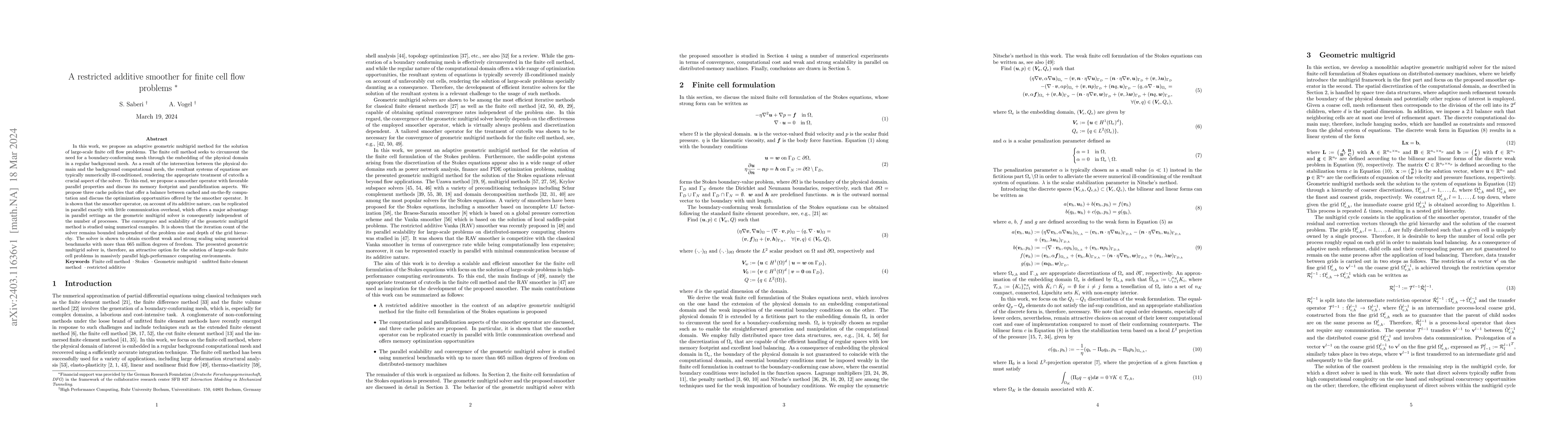This paper proposes an adaptive geometric multigrid method to solve large-scale finite cell flow problems, introducing a restricted additive smoother to manage the numerical ill-conditioning caused by intersecting meshes. The smoother exhibits favorable parallel properties and scalability, demonstrated through numerical examples showing consistent convergence across increasing problem sizes and grid depths.