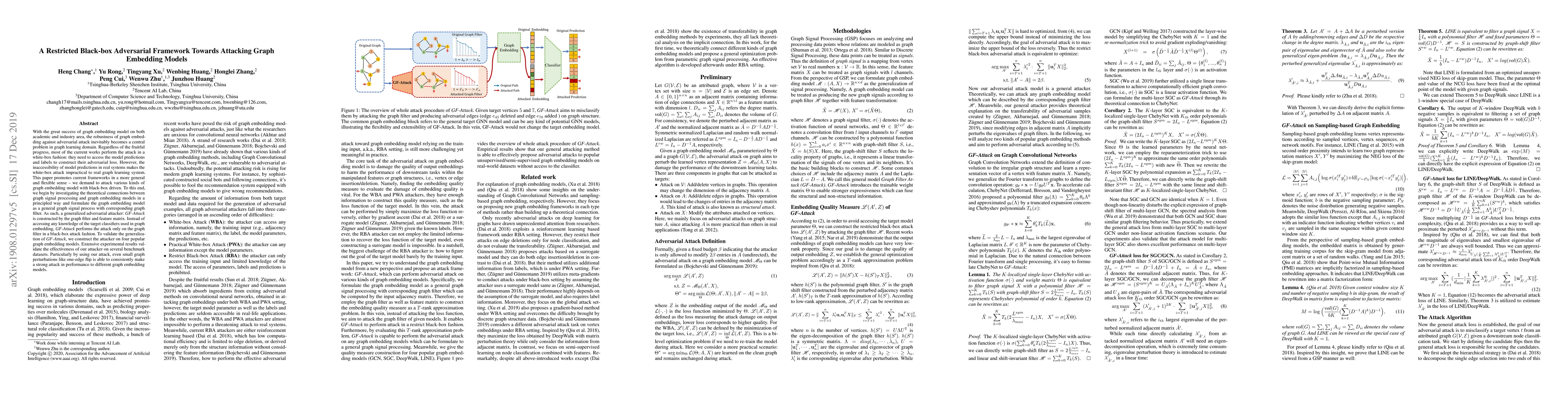This paper introduces a black-box adversarial framework, GF-Attack, to effectively attack graph embedding models without requiring access to model predictions. The framework leverages theoretical connections between graph signal processing and graph embedding models to construct an attack based on the graph filter and feature matrix, demonstrating its effectiveness across several benchmark datasets.