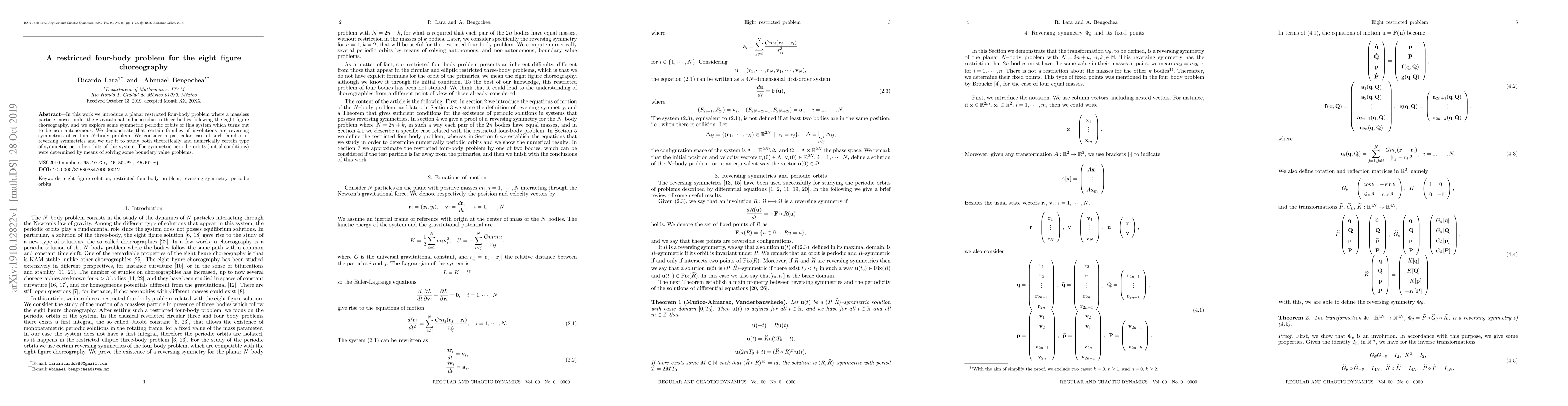 This paper investigates a planar restricted four-body problem where a massless particle orbits three bodies following an eight figure choreography, focusing on symmetric periodic orbits. It identifies reversing symmetries and uses them to theoretically and numerically study specific symmetric periodic orbits, determined by solving boundary value problems.
