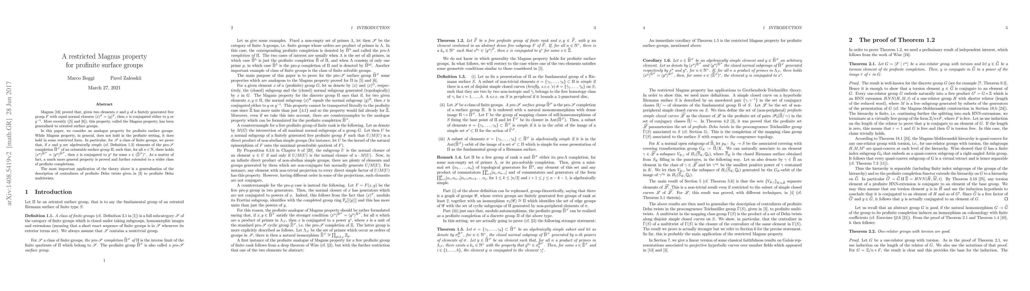 Magnus proved that, given two elements $x$ and $y$ of a finitely generated free group $F$ with equal normal closures $\langle x\rangle^F=\langle y\rangle^F$, then $x$ is conjugated either to $y$ or $y^{-1}$. More recently, this property, called the Magnus property, has been generalized to oriented surface groups. In this paper, we consider an analogue property for profinite surface groups. While Magnus property, in general, does not hold in the profinite setting, it does hold in some restricted form. In particular, for ${\mathscr S}$ a class of finite groups, we prove that, if $x$ and $y$ are \emph{algebraically simple} elements of the pro-${\mathscr S}$ completion $\hat{\Pi}^{\mathscr S}$ of an orientable surface group $\Pi$, such that, for all $n\in{\mathbb N}$, there holds $\langle x^n\rangle^{\hat{\Pi}^{\mathscr S}}=\langle y^n\rangle^{\hat{\Pi}^{\mathscr S}}$, then $x$ is conjugated to $y^s$ for some $s\in(\hat{\mathbb Z}^{\mathscr S})^\ast$. As a matter of fact, a much more general property is proved and further extended to a wider class of profinite completions. The most important application of the theory above is a generalization of the description of centralizers of profinite Dehn twists to profinite Dehn multitwists.