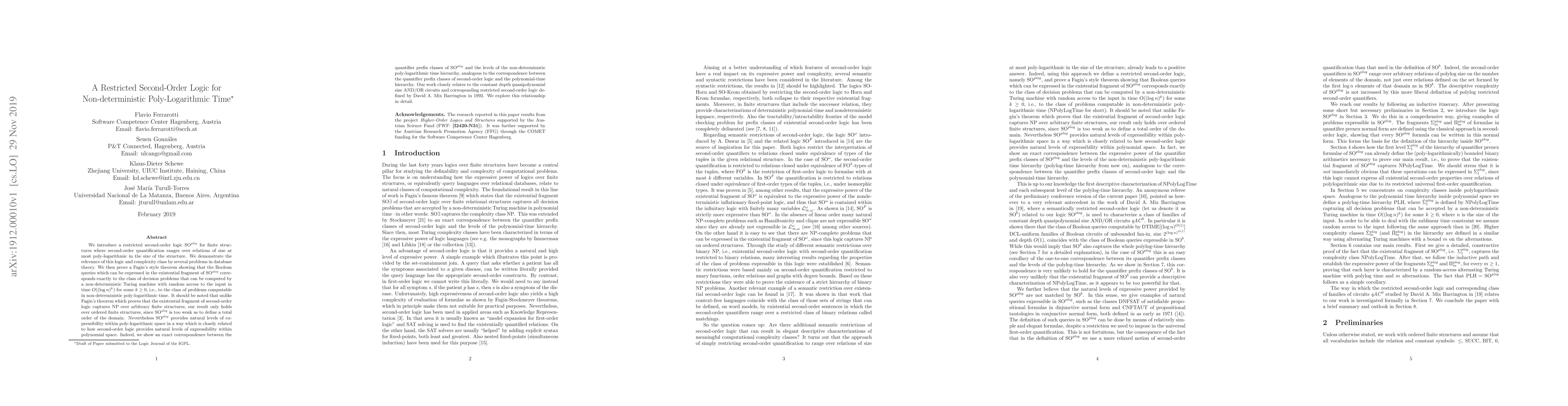 This paper introduces a restricted second-order logic $\mathrm{SO}^{\mathit{plog}}$ for finite structures, where second-order quantification is limited to poly-logarithmic size relations. It establishes a Fagin-style theorem linking $\mathrm{SO}^{\mathit{plog}}$ to non-deterministic poly-logarithmic time complexity, demonstrating its relevance in database theory.