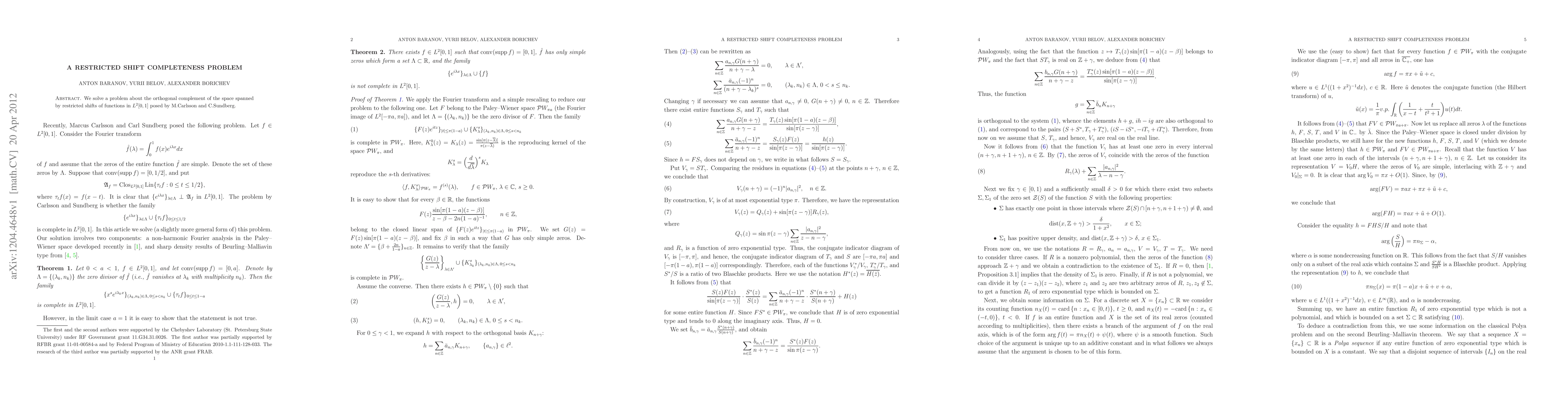 We solve a problem about the orthogonal complement of the space spanned by restricted shifts of functions in $L^2[0,1]$ posed by M.Carlsson and C.Sundberg.