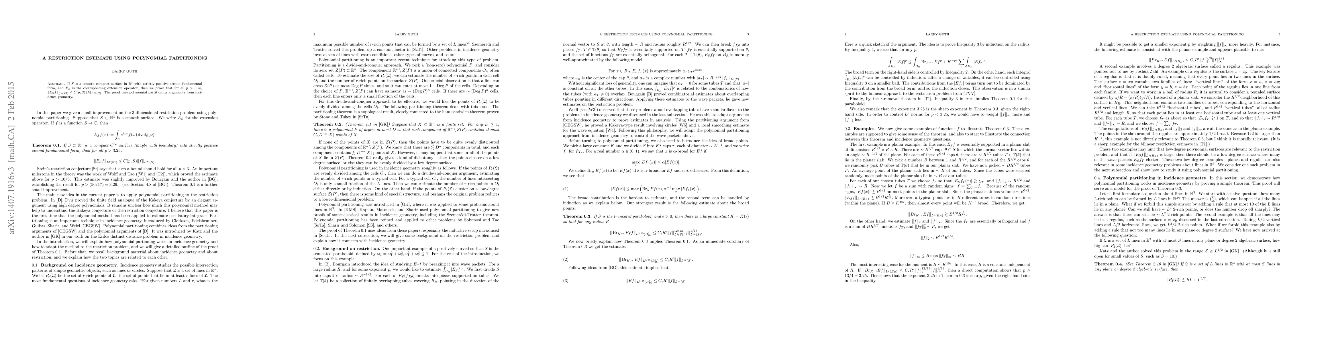 This paper proves a restriction estimate for smooth compact surfaces in $\mathbb{R}^3$ using polynomial partitioning techniques from incidence geometry, showing that the extension operator $E_S$ satisfies $\| E_S f\|_{L^p(\mathbb{R}^3)} \le C(p,S) \| f \|_{L^\infty(S)}$ for all $p > 3.25$.