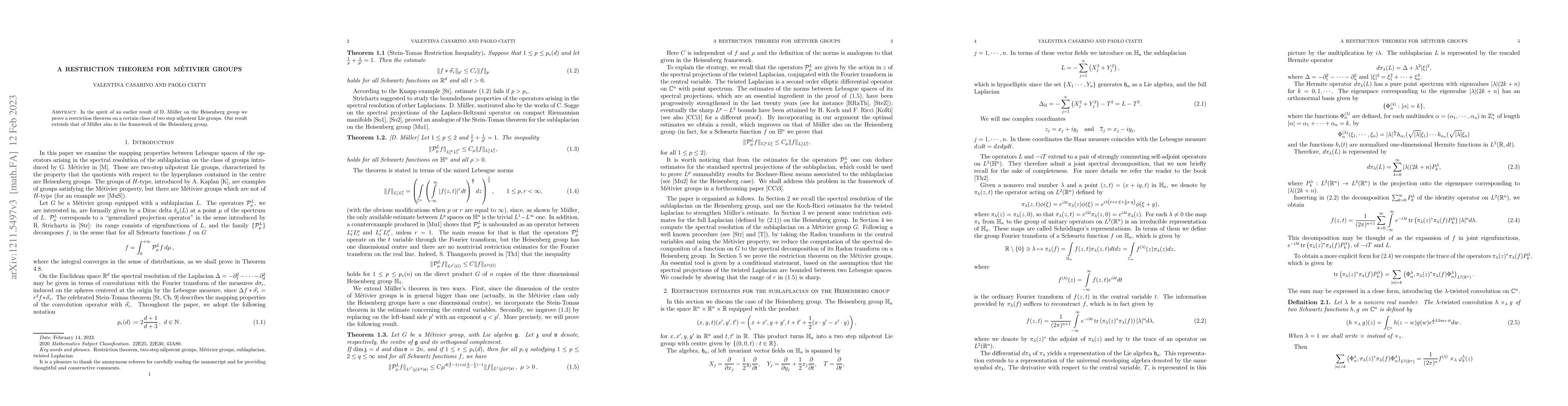 Summary: This paper extends Müller's earlier restriction theorem on the Heisenberg group to a broader class of two-step nilpotent Lie groups, providing a new result within the framework of M\'etivier groups.