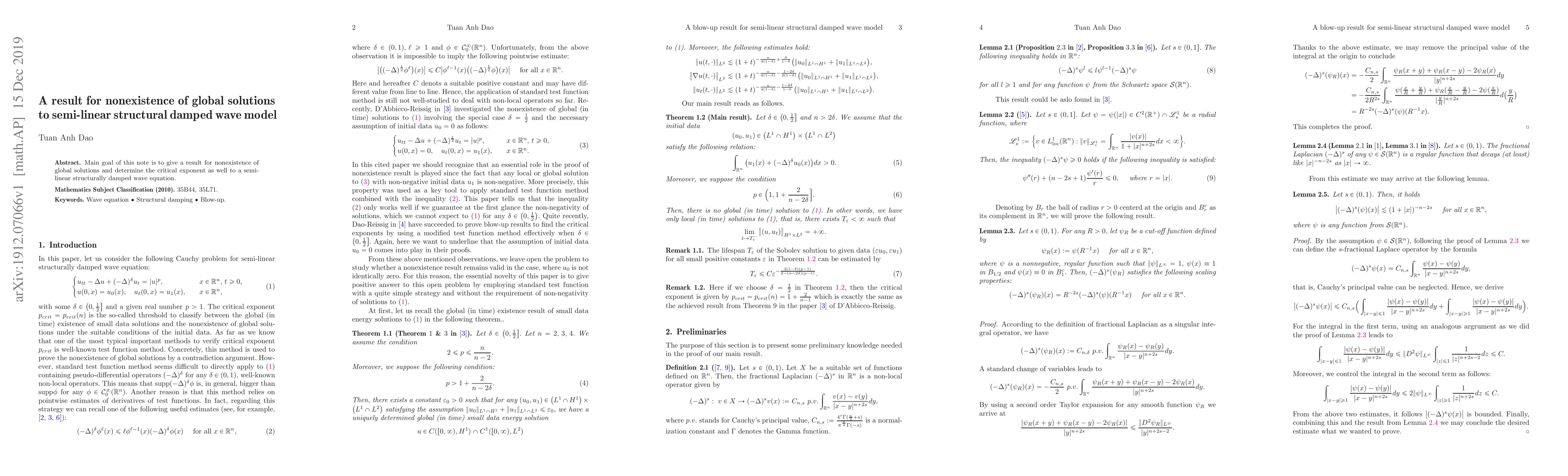 Summary: This paper establishes a nonexistence result for global solutions to a semi-linear structurally damped wave equation, identifying a critical exponent that delineates the conditions under which such solutions fail to exist.