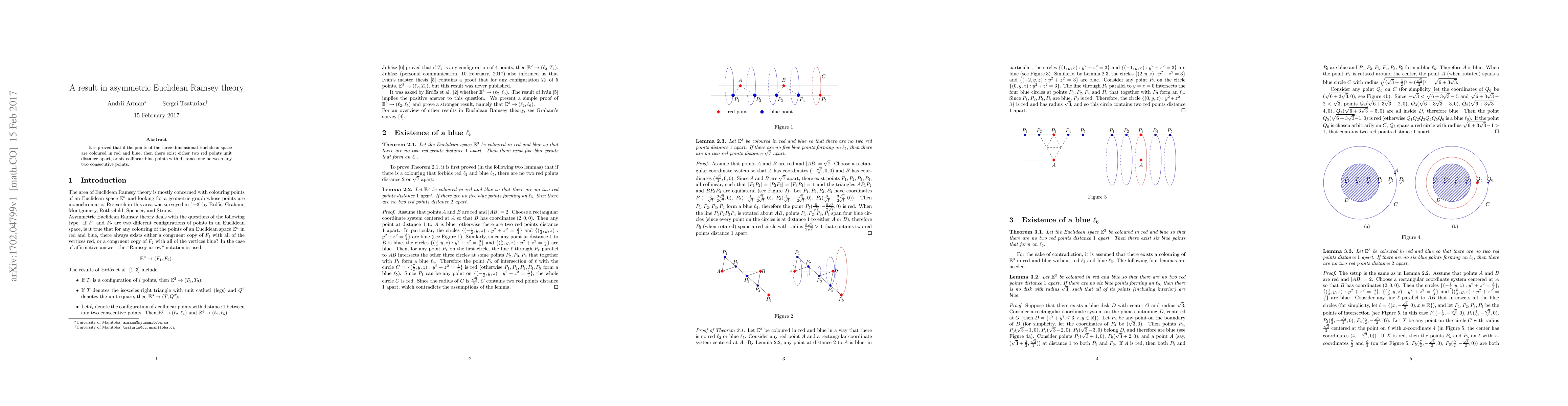 It is proved that if the points of the three-dimensional Euclidean space are coloured in red and blue, then there exist either two red points unit distance apart, or six collinear blue points with distance one between any two consecutive points.