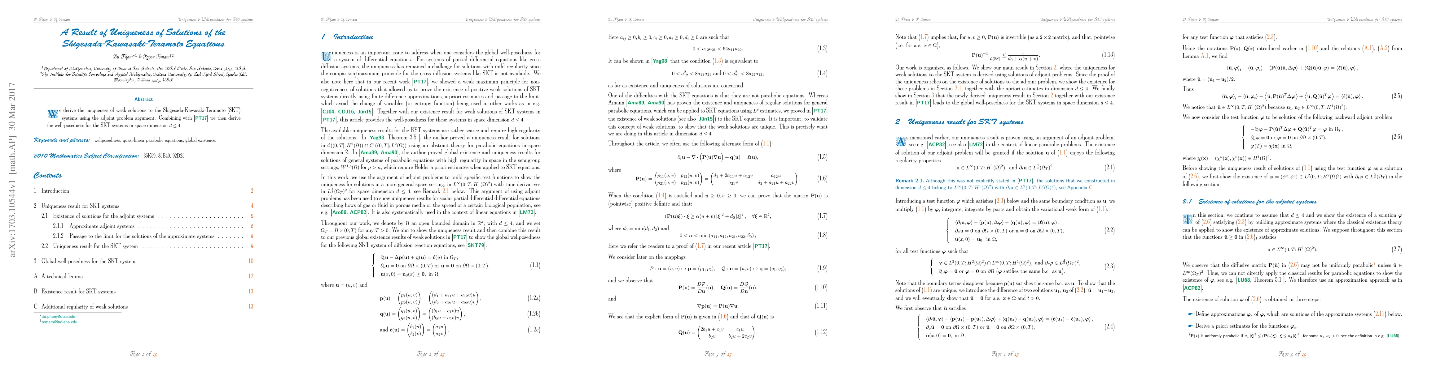 This paper establishes the uniqueness of weak solutions to the Shigesada-Kawasaki-Teramoto (SKT) equations using the adjoint problem method. It further combines this result with prior work to demonstrate well-posedness for the SKT systems in dimensions $d \leq 4$.