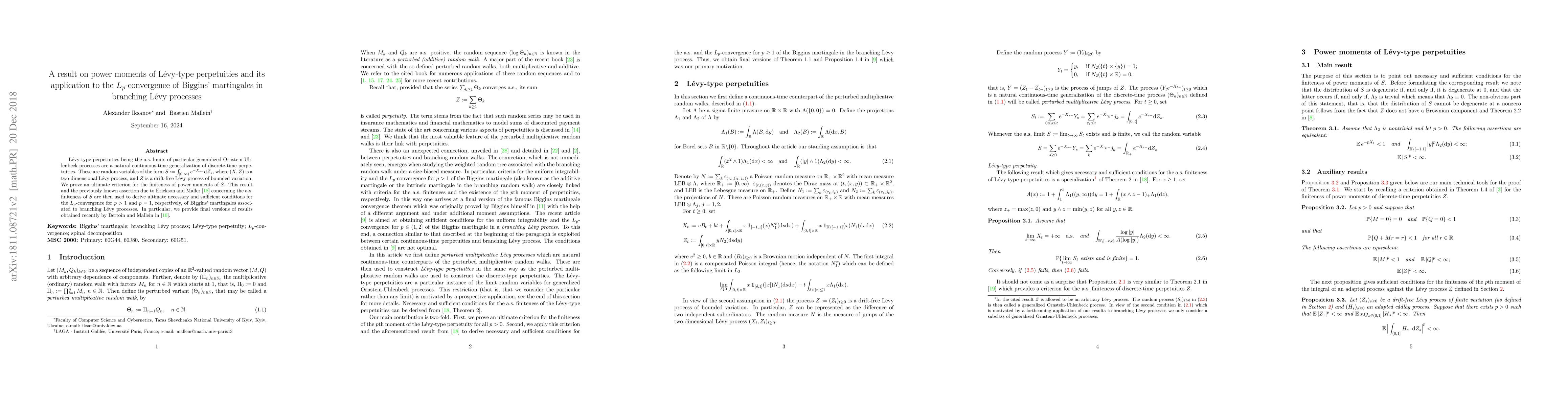 L\'evy-type perpetuities being the a.s. limits of particular generalized Ornstein-Uhlenbeck processes are a natural continuous-time generalization of discrete-time perpetuities. These are random variables of the form $S:=\int_{[0,\infty)}e^{-X_{s-}}{\mathrm{d}}Z_s$, where $(X,Z)$ is a two-dimensional L\'evy process, and $Z$ is a drift-free L\'evy process of bounded variation. We prove an ultimate criterion for the finiteness of power moments of $S$. This result and the previously known assertion due to Erickson and Maller (2005) concerning the a.s. finiteness of $S$ are then used to derive ultimate necessary and sufficient conditions for the $L_p$-convergence for $p>1$ and $p=1$, respectively, of Biggins' martingales associated to branching L\'evy processes. In particular, we provide final versions of results obtained recently by Bertoin and Mallein (2018).