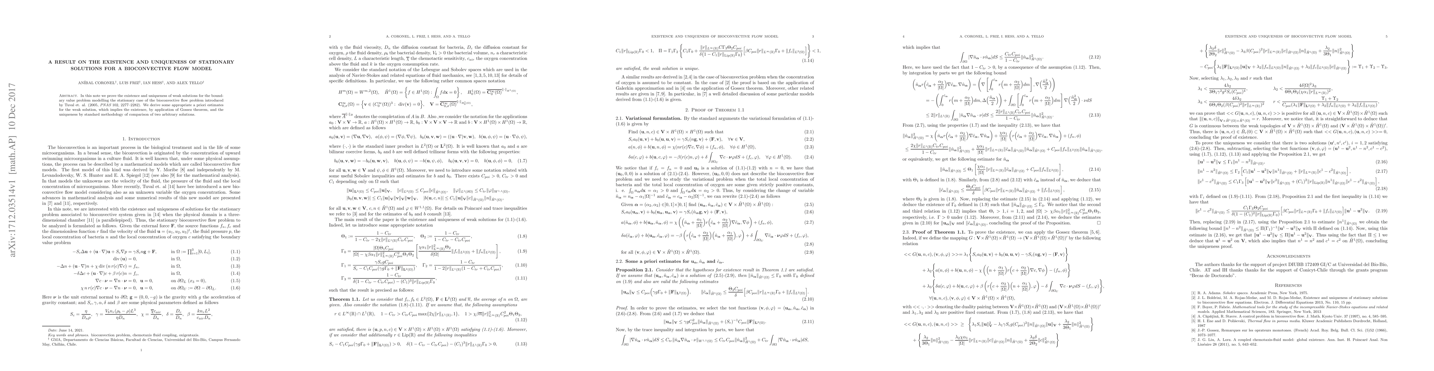 In this note we prove the existence and uniqueness of weak solutions for the boundary value problem modelling the stationary case of the bioconvective flow problem introduced by Tuval et. al. (2005, {\it PNAS} 102, 2277--2282). We derive some appropriate a priori estimates for the weak solution, which implies the existence, by application of Gossez theorem, and the uniqueness by standard methodology of comparison of two arbitrary solutions.