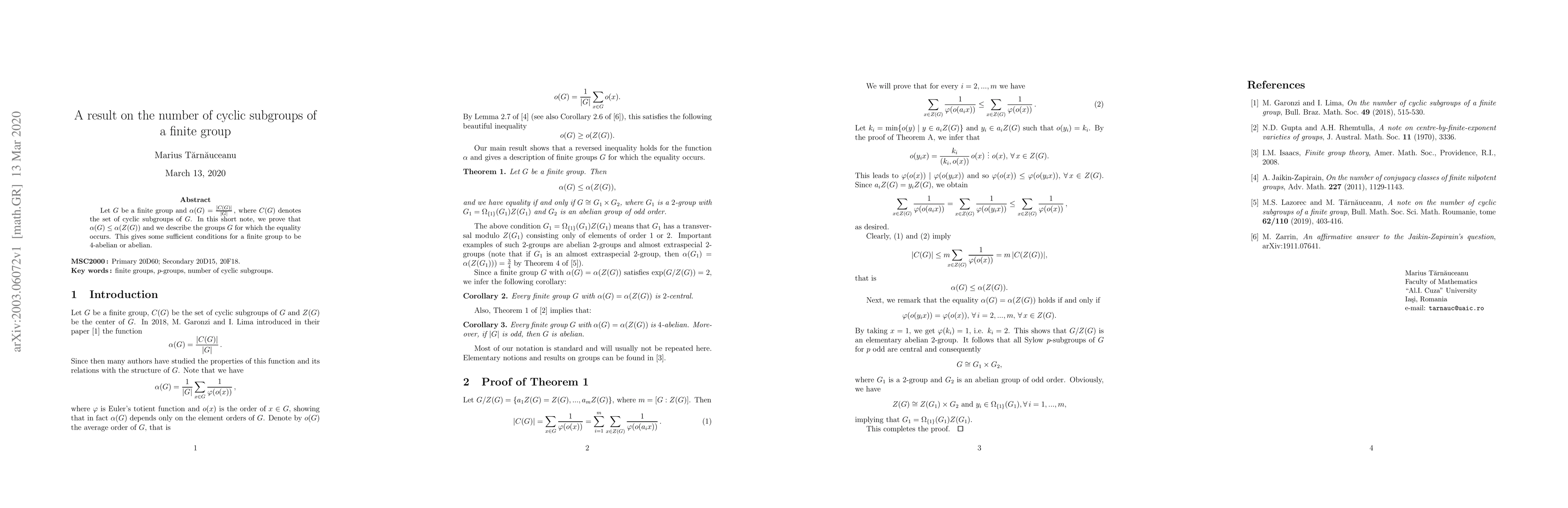 Let $G$ be a finite group and $\alpha(G)=\frac{|C(G)|}{|G|}$\,, where $C(G)$ denotes the set of cyclic subgroups of $G$. In this short note, we prove that $\alpha(G)\leq\alpha(Z(G))$ and we describe the groups $G$ for which the equality occurs. This gives some sufficient conditions for a finite group to be $4$-abelian or abelian.