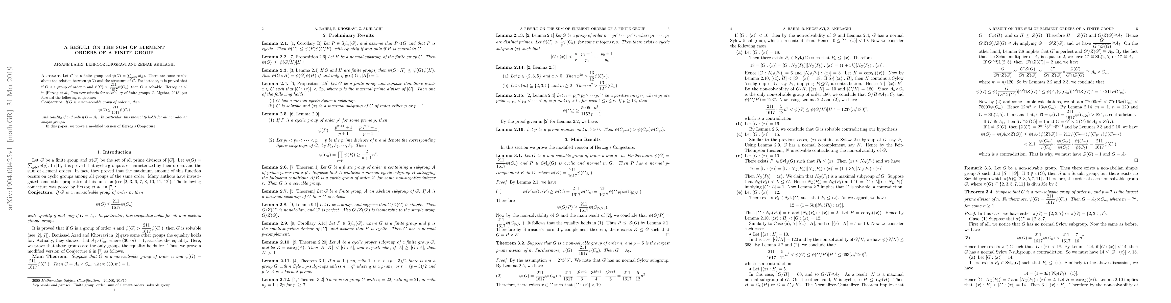 Let $G$ be a finite group and $\psi(G)=\sum_{g\in{G}}{o(g)}$. There are some results about the relation between $\psi(G)$ and the structure of $G$. For instance, it is proved that if $G$ is a group of order $n$ and $\psi(G)>\dfrac{211}{1617}\psi(C_n)$, then $G$ is solvable. Herzog {\it{et al.}} in [Herzog {\it{et al.}}, Two new criteria for solvability of finite groups, J. Algebra, 2018] put forward the following conjecture: \noindent{\bf Conjecture.} {\it {If $G$ is a non-solvable group of order $n$, then $${\psi(G)}\,{\leq}\,{{\dfrac{211}{1617}}{\psi(C_n)}}$$ with equality if and only if $G=A_5$. In particular, this inequality holds for all non-abelian simple groups.} } In this paper, we prove a modified version of Herzog's Conjecture.