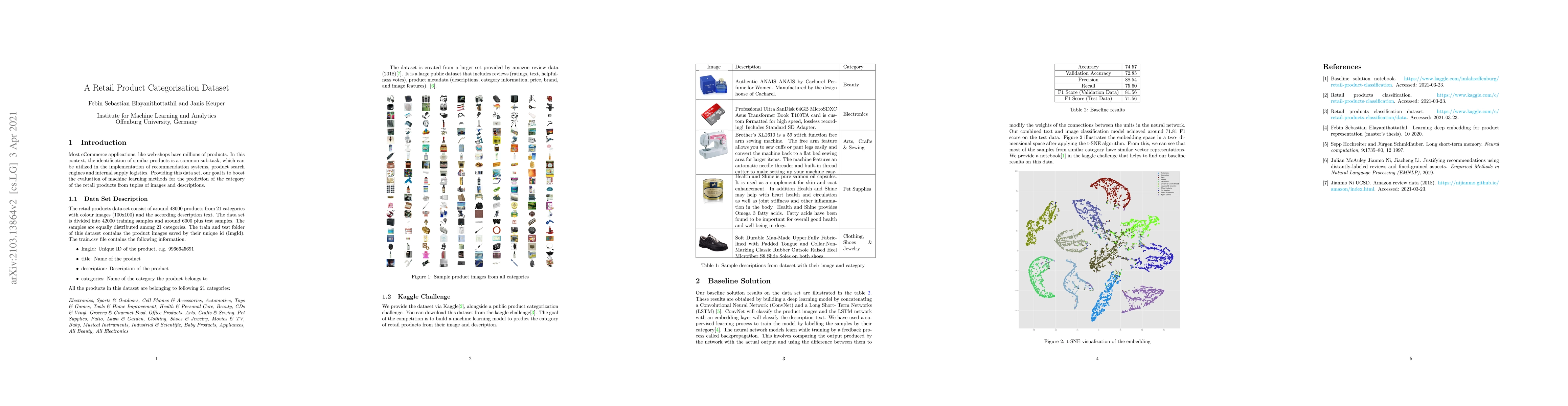 Most eCommerce applications, like web-shops have millions of products. In this context, the identification of similar products is a common sub-task, which can be utilized in the implementation of recommendation systems, product search engines and internal supply logistics. Providing this data set, our goal is to boost the evaluation of machine learning methods for the prediction of the category of the retail products from tuples of images and descriptions.