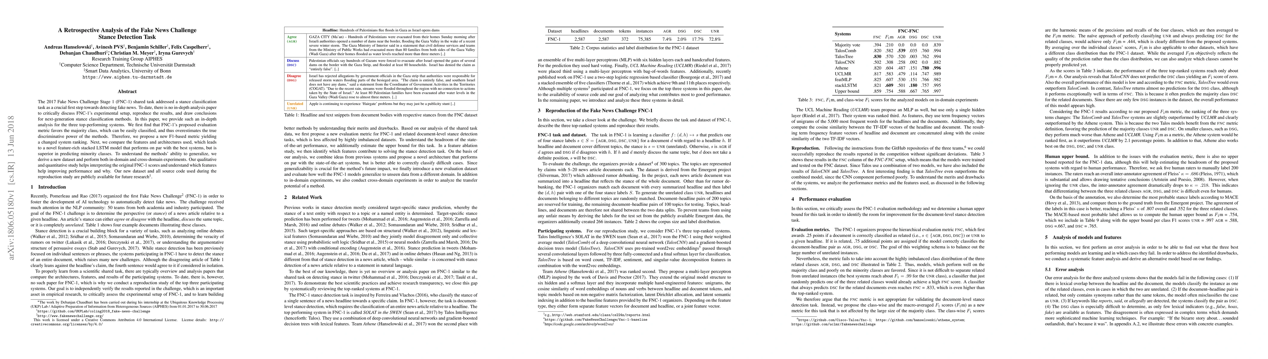 This paper conducts a detailed retrospective analysis of the top systems from the 2017 Fake News Challenge Stage 1, revealing that the original evaluation metric overestimated performance. The authors propose a new F1-based metric and develop a feature-rich stacked LSTM model that better predicts minority classes, while also making the original results more interpretable.