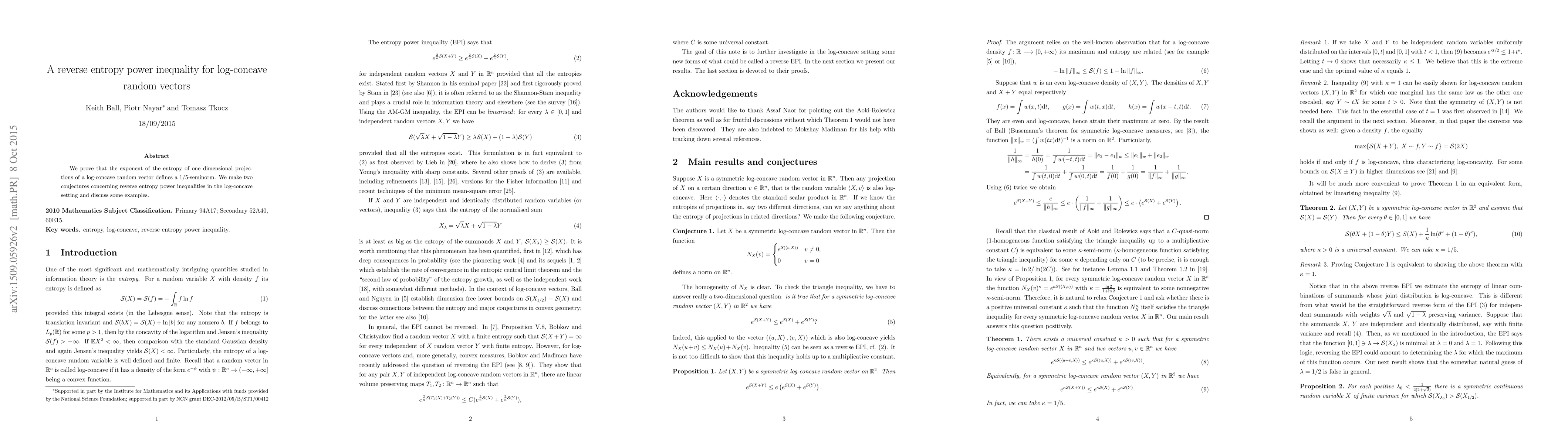 The paper introduces a novel approach to reverse entropy power inequalities for log-concave random vectors, proving that the entropy exponent defines a 1/5-seminorm.