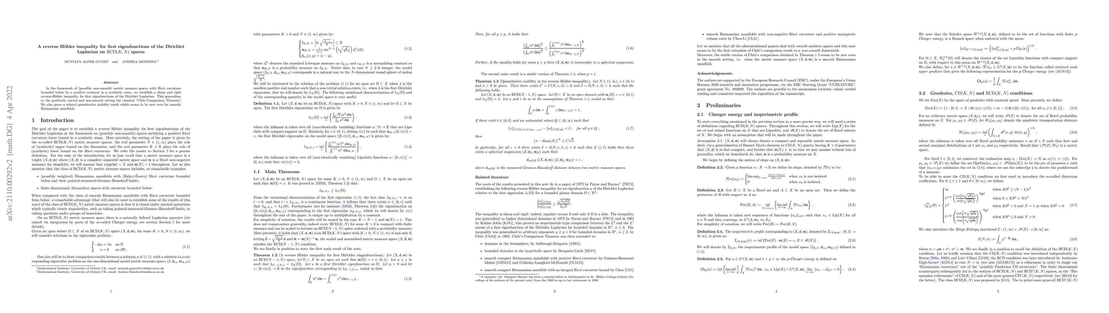 Summary: This paper establishes a sharp reverse Hölder inequality for first eigenfunctions of the Dirichlet Laplacian in non-smooth metric measure spaces with Ricci curvature bounded below, generalizing the classical Chiti Comparison Theorem. Additionally, it presents a new quantitative stability result for these eigenfunctions.