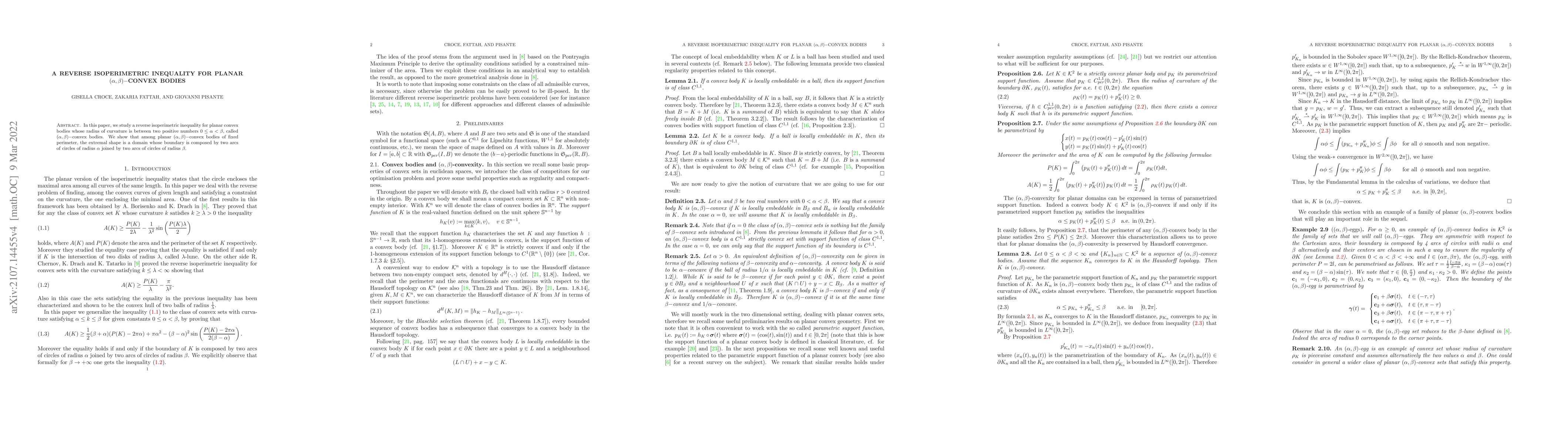 This paper investigates a reverse isoperimetric inequality for planar ($\alpha$, $\beta$)--convex bodies, demonstrating that the extremal shape among bodies of fixed perimeter is a domain bounded by two arcs of circles of radius $\alpha$ and two arcs of circles of radius $\beta$.