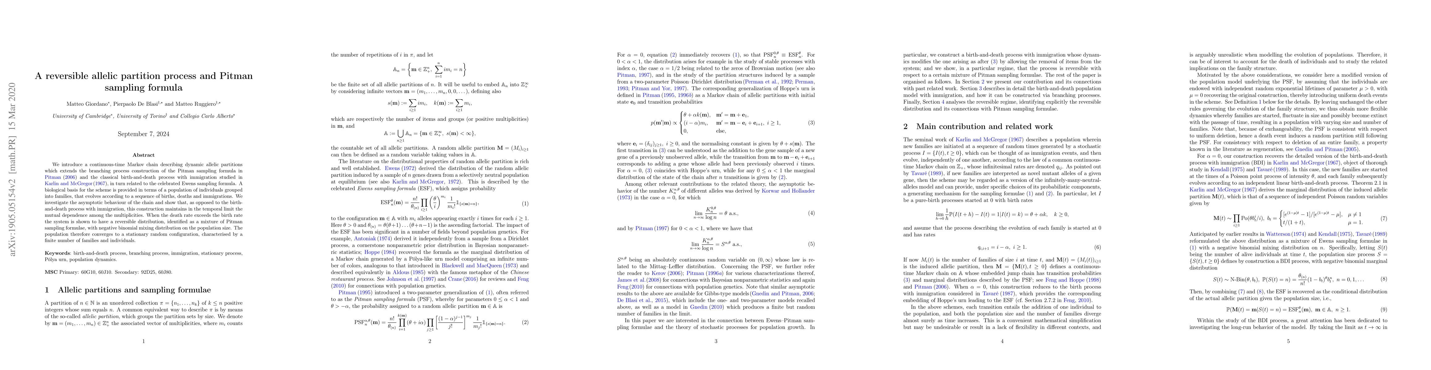 We introduce a continuous-time Markov chain describing dynamic allelic partitions which extends the branching process construction of the Pitman sampling formula in Pitman (2006) and the birth-and-death process with immigration studied in Karlin and McGregor (1967), in turn related to the celebrated Ewens sampling formula. A biological basis for the scheme is provided in terms of a population of individuals grouped into families, that evolves according to a sequence of births, deaths and immigrations. We investigate the asymptotic behaviour of the chain and show that, as opposed to the birth-and-death process with immigration, this construction maintains in the temporal limit the mutual dependence among the multiplicities. When the death rate exceeds the birth rate, the system is shown to have reversible distribution identified as a mixture of Pitman sampling formulae, with negative binomial mixing distribution on the population size. The population therefore converges to a stationary random configuration, characterised by a finite number of families and individuals.