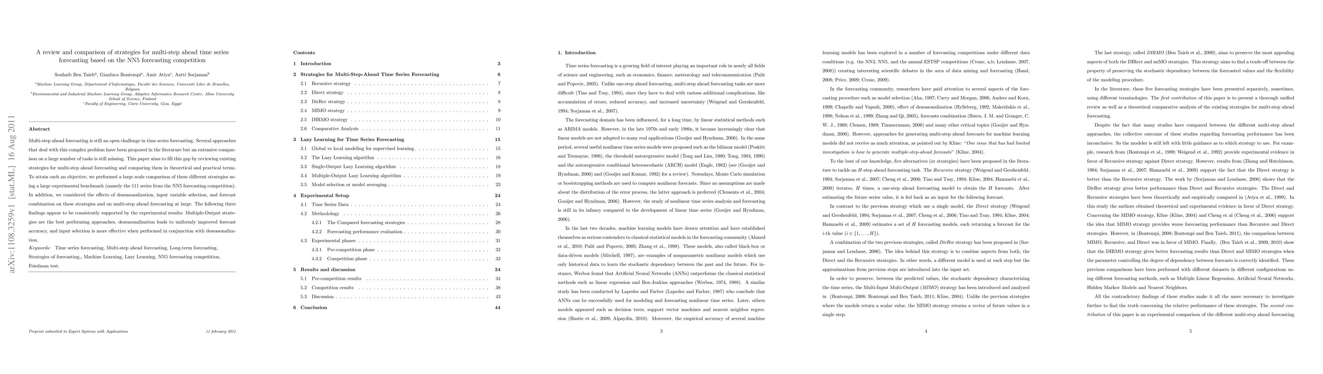 This paper reviews and compares various strategies for multi-step ahead time series forecasting, using the NN5 competition dataset. It finds that Multiple-Output strategies outperform others, deseasonalization consistently enhances forecast accuracy, and input selection is more effective when combined with deseasonalization.