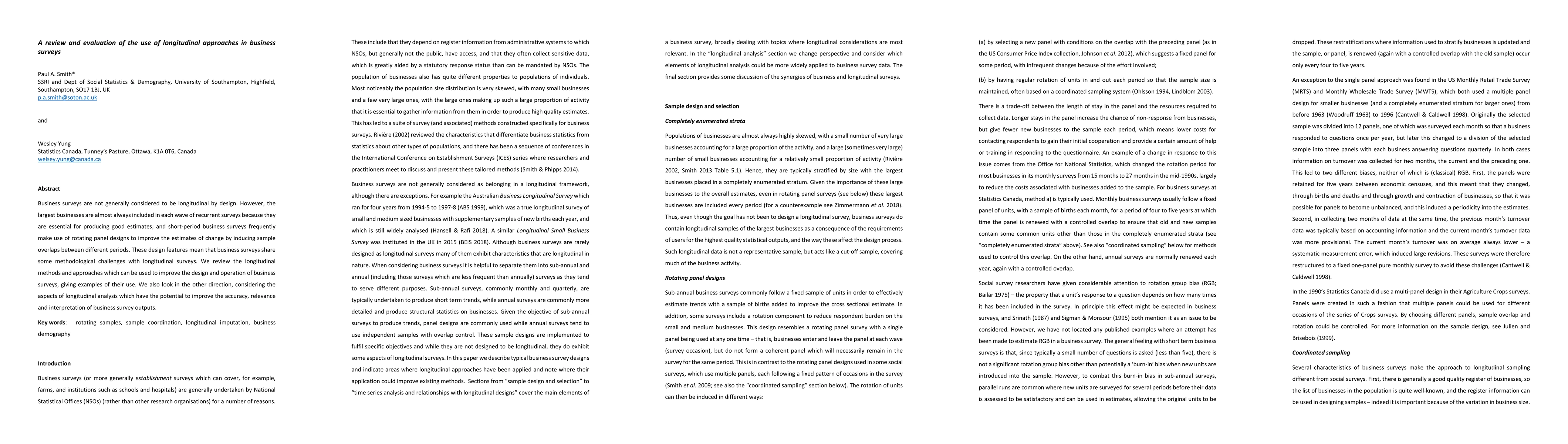 Business surveys are not generally considered to be longitudinal by design. However, the largest businesses are almost always included in each wave of recurrent surveys because they are essential for producing good estimates; and short-period business surveys frequently make use of rotating panel designs to improve the estimates of change by inducing sample overlaps between different periods. These design features mean that business surveys share some methodological challenges with longitudinal surveys. We review the longitudinal methods and approaches which can be used to improve the design and operation of business surveys, giving examples of their use. We also look in the other direction, considering the aspects of longitudinal analysis which have the potential to improve the accuracy, relevance and interpretation of business survey outputs.
