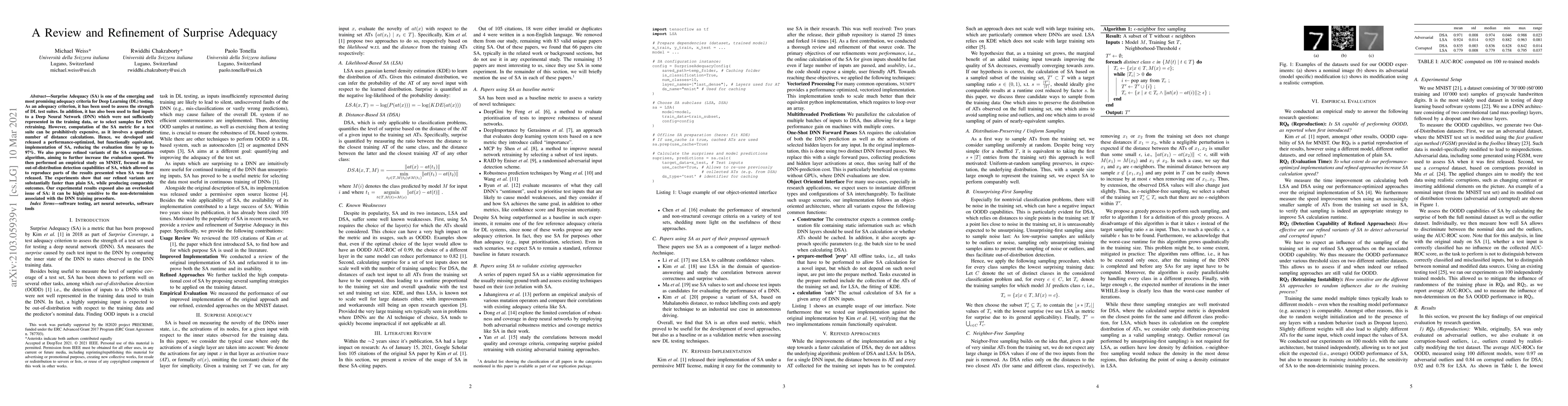 This paper reviews and refines the Surprise Adequacy (SA) metric for Deep Learning testing, presenting a performance-optimized implementation that reduces evaluation time by up to 97%. The authors propose refined SA variants that maintain comparable outcomes while being substantially faster, and highlight SA's sensitivity to DNN training non-determinism.