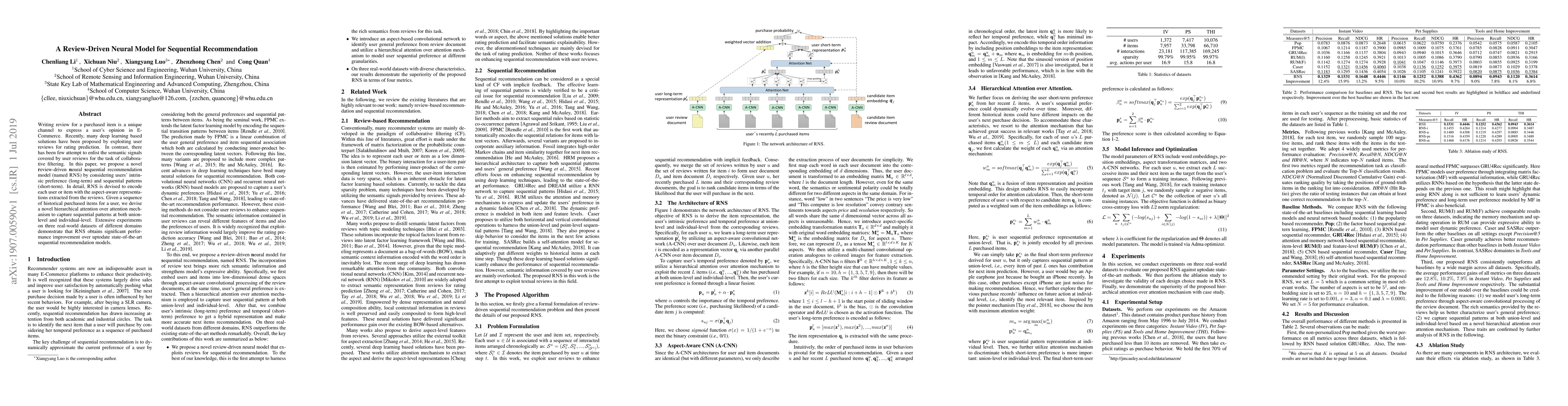 A new neural model called RNS leverages user reviews to improve sequential recommendations in e-commerce by capturing both long-term preferences and short-term patterns. It outperforms existing models on three real-world datasets.