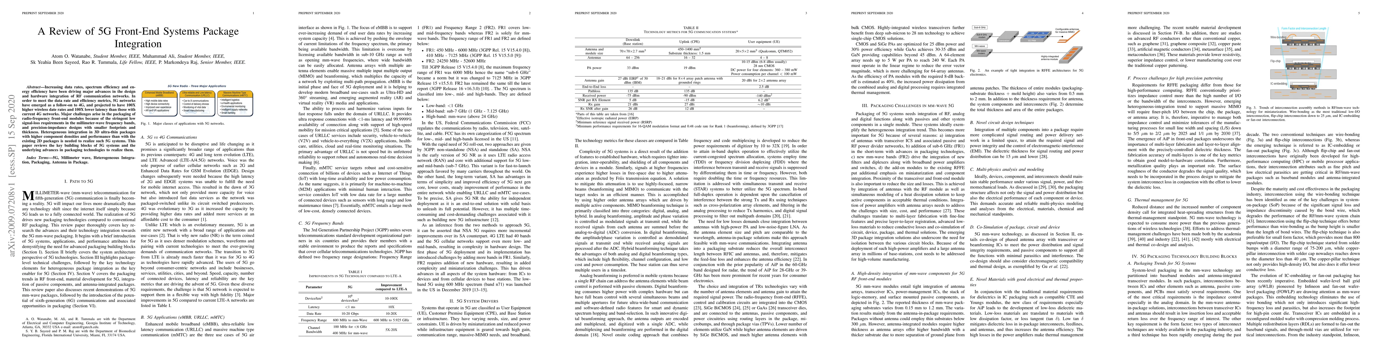Increasing data rates, spectrum efficiency and energy efficiency have been driving major advances in the design and hardware integration of RF communication networks. In order to meet the data rate and efficiency metrics, 5G networks have emerged as a follow-on to 4G, and projected to have 100X higher wireless date rates and 100X lower latency than those with current 4G networks. Major challenges arise in the packaging of radio-frequency front-end modules because of the stringent low signal-loss requirements in the millimeter-wave frequency bands, and precision-impedance designs with smaller footprints and thickness. Heterogeneous integration in 3D ultra-thin packages with higher component densities and performance than with the existing 2D packages is needed to realize such 5G systems. This paper reviews the key building blocks of 5G systems and the underlying advances in packaging technologies to realize them.