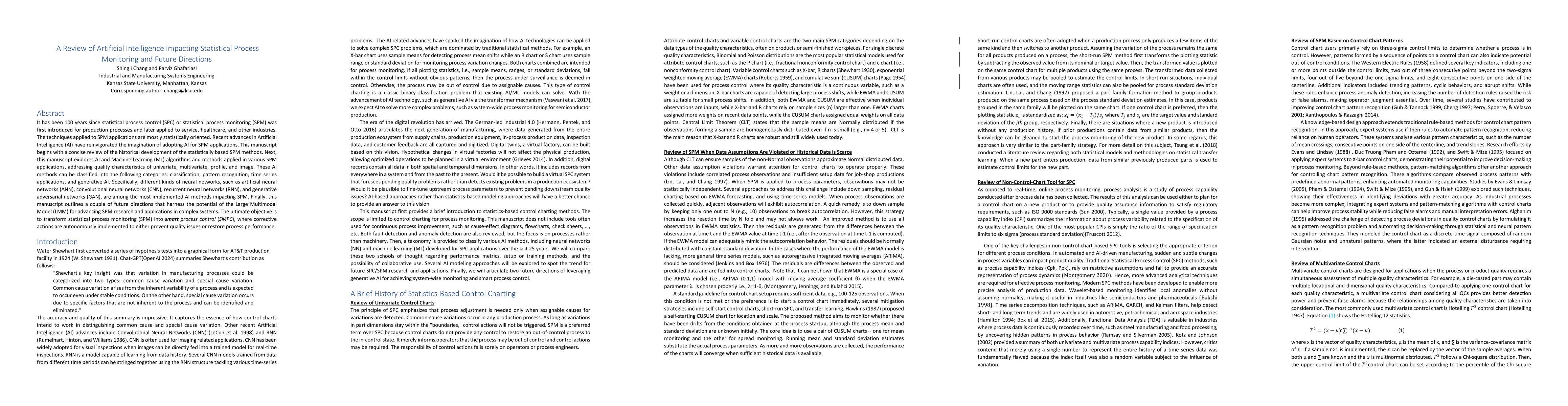 It has been 100 years since statistical process control (SPC) or statistical process monitoring (SPM) was first introduced for production processes and later applied to service, healthcare, and other industries. The techniques applied to SPM applications are mostly statistically oriented. Recent advances in Artificial Intelligence (AI) have reinvigorated the imagination of adopting AI for SPM applications. This manuscript begins with a concise review of the historical development of the statistically based SPM methods. Next, this manuscript explores AI and Machine Learning (ML) algorithms and methods applied in various SPM applications, addressing quality characteristics of univariate, multivariate, profile, and image. These AI methods can be classified into the following categories: classification, pattern recognition, time series applications, and generative AI. Specifically, different kinds of neural networks, such as artificial neural networks (ANN), convolutional neural networks (CNN), recurrent neural networks (RNN), and generative adversarial networks (GAN), are among the most implemented AI methods impacting SPM. Finally, this manuscript outlines a couple of future directions that harness the potential of the Large Multimodal Model (LMM) for advancing SPM research and applications in complex systems. The ultimate objective is to transform statistical process monitoring (SPM) into smart process control (SMPC), where corrective actions are autonomously implemented to either prevent quality issues or restore process performance.