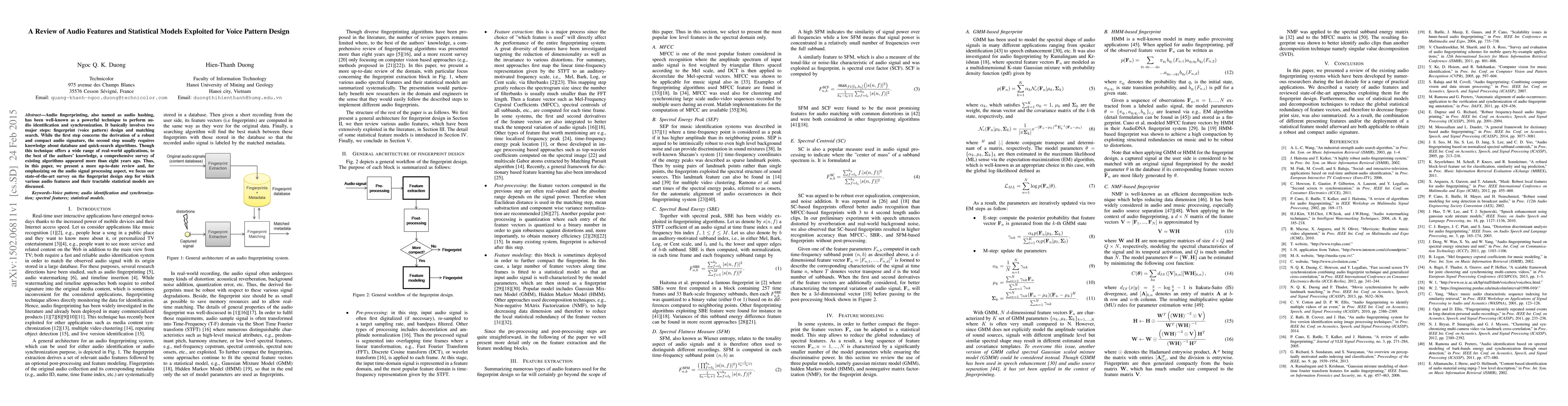 Audio fingerprinting, also named as audio hashing, has been well-known as a powerful technique to perform audio identification and synchronization. It basically involves two major steps: fingerprint (voice pattern) design and matching search. While the first step concerns the derivation of a robust and compact audio signature, the second step usually requires knowledge about database and quick-search algorithms. Though this technique offers a wide range of real-world applications, to the best of the authors' knowledge, a comprehensive survey of existing algorithms appeared more than eight years ago. Thus, in this paper, we present a more up-to-date review and, for emphasizing on the audio signal processing aspect, we focus our state-of-the-art survey on the fingerprint design step for which various audio features and their tractable statistical models are discussed.