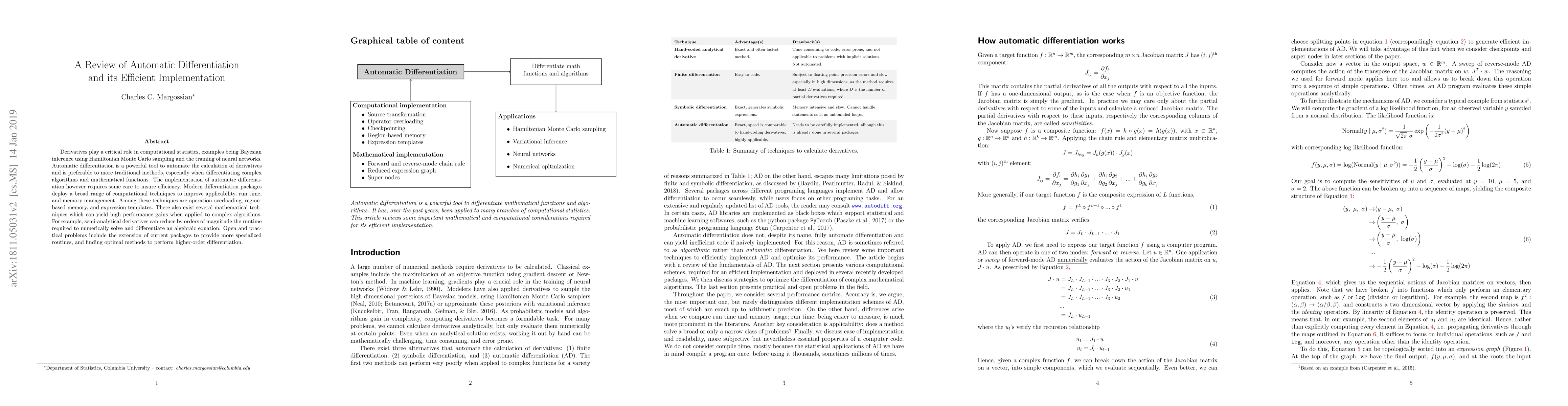 This paper reviews automatic differentiation's role in computational statistics, emphasizing its advantages over traditional methods for complex algorithms. It discusses efficient implementation techniques like operation overloading and expression templates, and highlights open problems such as higher-order differentiation and specialized routines.