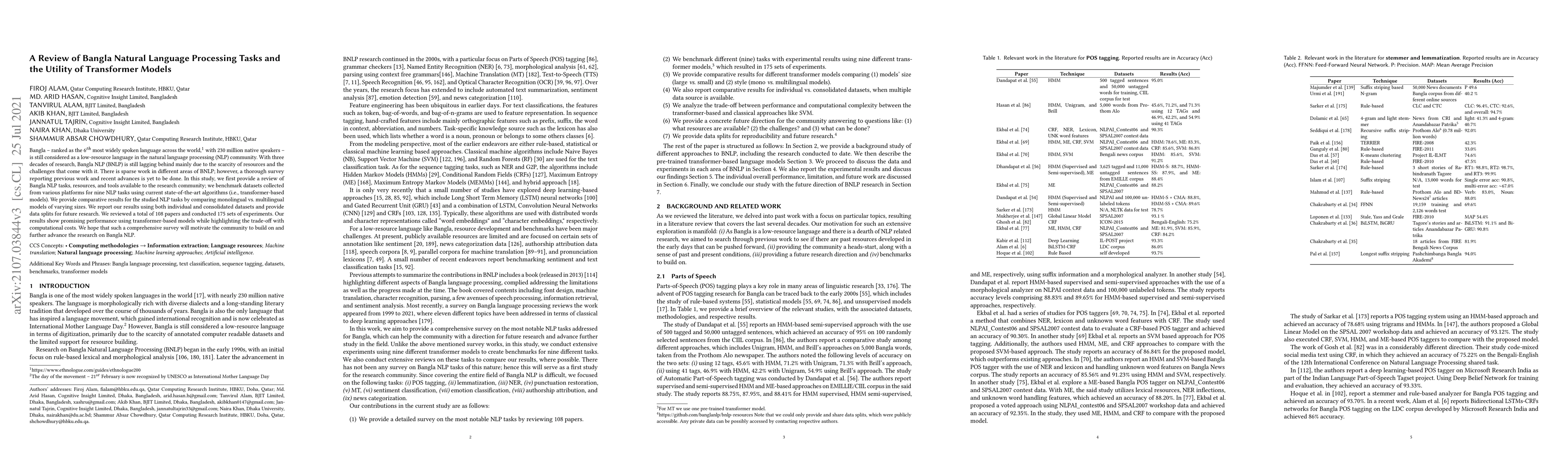 This paper reviews Bangla NLP tasks, resources, and tools, benchmarking datasets for nine NLP tasks using transformer models. It highlights promising results from transformer-based models but notes associated computational costs, aiming to motivate further research in this low-resource language field.