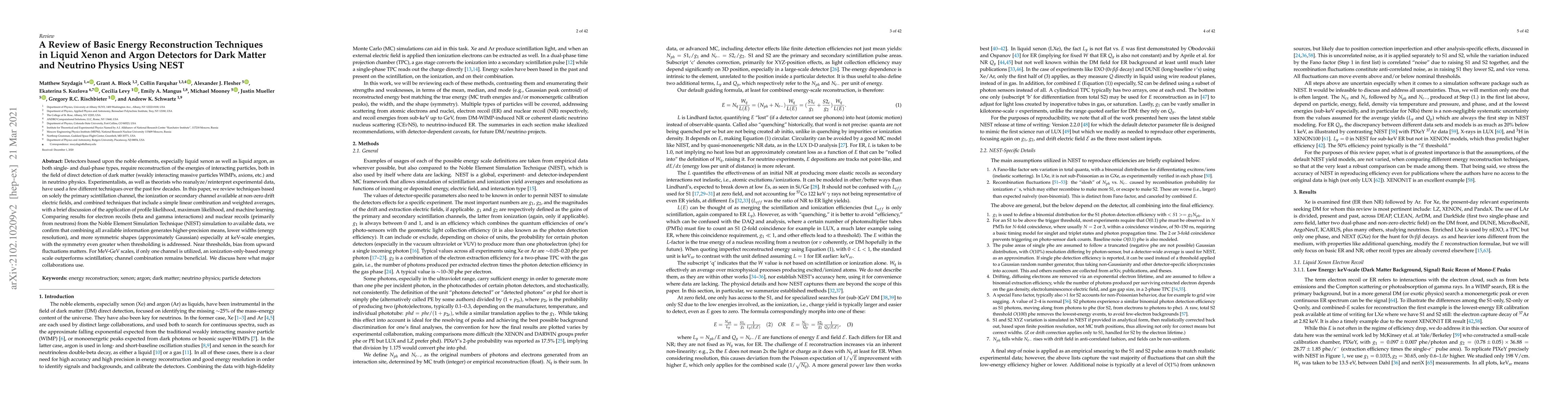 Detectors based upon the noble elements, especially liquid xenon as well as liquid argon, as both single- and dual-phase types, require reconstruction of the energies of interacting particles, both in the field of direct detection of dark matter (Weakly Interacting Massive Particles or WIMPs, axions, etc.) and in neutrino physics. Experimentalists, as well as theorists who reanalyze/reinterpret experimental data, have used a few different techniques over the past few decades. In this paper, we review techniques based on solely the primary scintillation channel, the ionization or secondary channel available at non-zero drift electric fields, and combined techniques that include a simple linear combination and weighted averages, with a brief discussion of the applications of profile likelihood, maximum likelihood, and machine learning. Comparing results for electron recoils (beta and gamma interactions) and nuclear recoils (primarily from neutrons) from the Noble Element Simulation Technique (NEST) simulation to available data, we confirm that combining all available information generates higher-precision means, lower widths (energy resolution), and more symmetric shapes (approximately Gaussian) especially at keV-scale energies, with the symmetry even greater when thresholding is addressed. Near thresholds, bias from upward fluctuations matters. For MeV-GeV scales, if only one channel is utilized, an ionization-only-based energy scale outperforms scintillation; channel combination remains beneficial. We discuss here what major collaborations use.