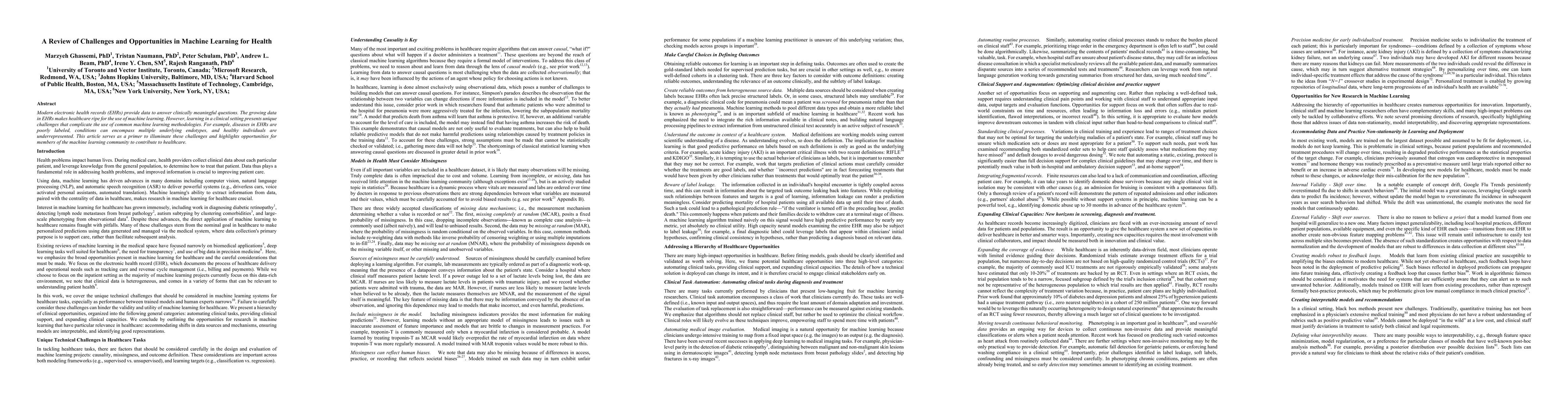 This review explores the challenges in applying machine learning to electronic health records due to poor labeling, complex disease conditions, and underrepresented healthy data, while also identifying opportunities for machine learning advancements in healthcare.