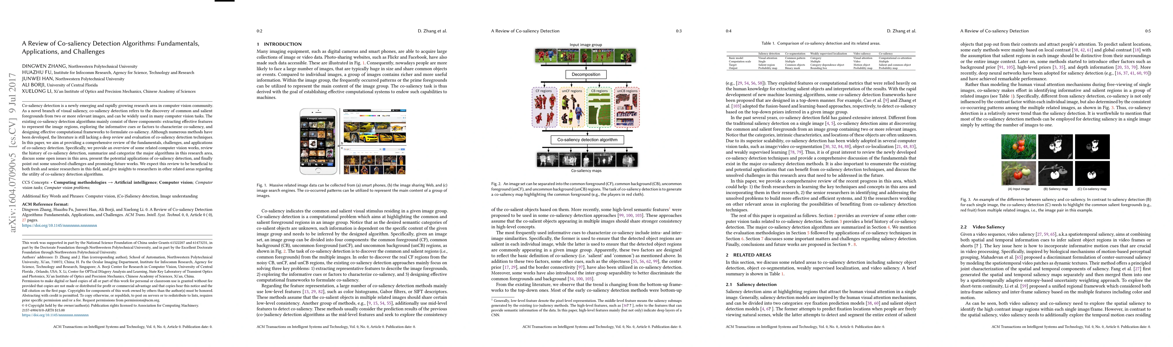 This paper provides a comprehensive review of co-saliency detection techniques, summarizing their fundamentals, categorizing major algorithms, and discussing applications and challenges. It aims to offer insights for both novice and experienced researchers in computer vision.
