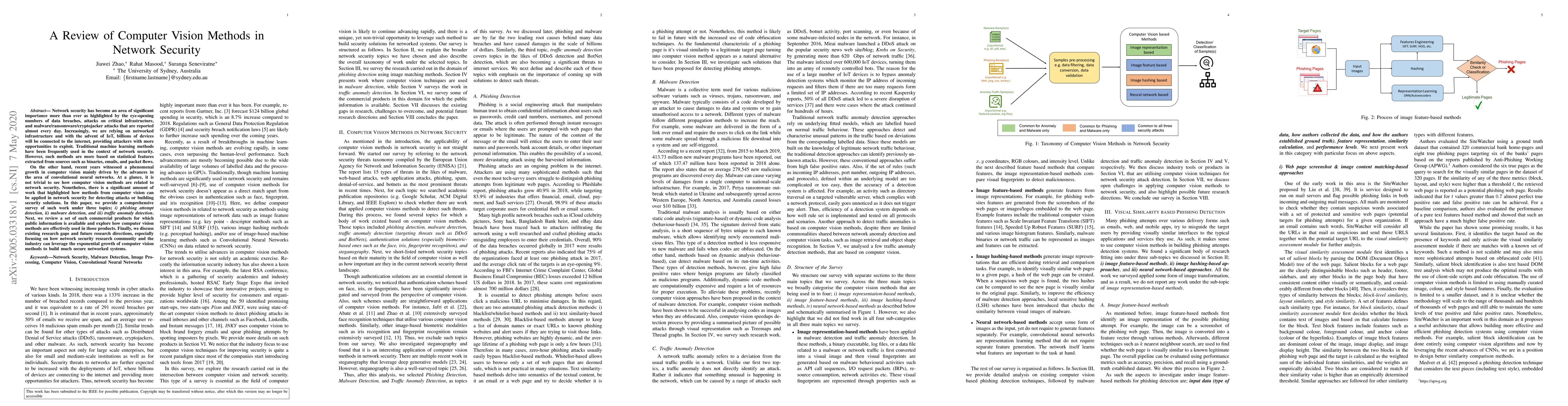 This paper reviews the application of computer vision methods in network security, focusing on phishing detection, malware detection, and traffic anomaly detection. It surveys existing research and commercial products utilizing these methods, highlighting opportunities and gaps for future advancements in securing networked systems.