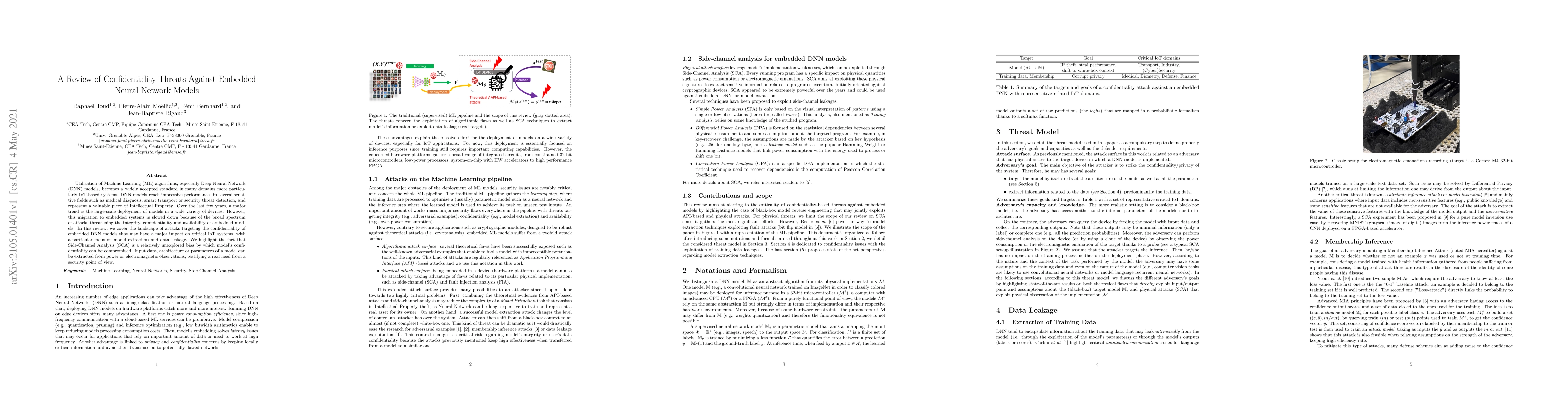 Utilization of Machine Learning (ML) algorithms, especially Deep Neural Network (DNN) models, becomes a widely accepted standard in many domains more particularly IoT-based systems. DNN models reach impressive performances in several sensitive fields such as medical diagnosis, smart transport or security threat detection, and represent a valuable piece of Intellectual Property. Over the last few years, a major trend is the large-scale deployment of models in a wide variety of devices. However, this migration to embedded systems is slowed down because of the broad spectrum of attacks threatening the integrity, confidentiality and availability of embedded models. In this review, we cover the landscape of attacks targeting the confidentiality of embedded DNN models that may have a major impact on critical IoT systems, with a particular focus on model extraction and data leakage. We highlight the fact that Side-Channel Analysis (SCA) is a relatively unexplored bias by which model's confidentiality can be compromised. Input data, architecture or parameters of a model can be extracted from power or electromagnetic observations, testifying a real need from a security point of view.