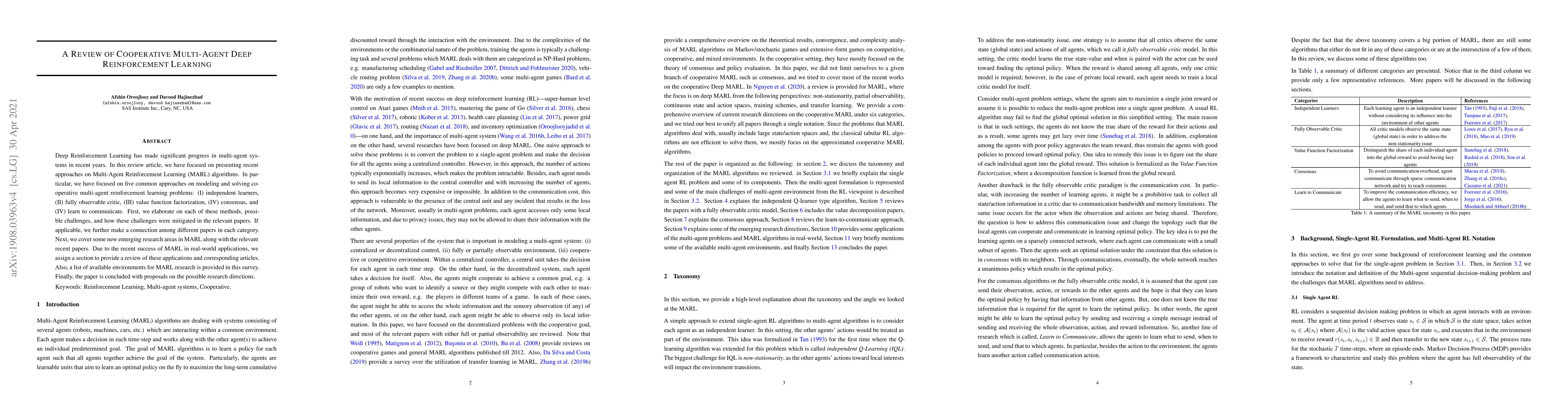 Deep Reinforcement Learning has made significant progress in multi-agent systems in recent years. In this review article, we have focused on presenting recent approaches on Multi-Agent Reinforcement Learning (MARL) algorithms. In particular, we have focused on five common approaches on modeling and solving cooperative multi-agent reinforcement learning problems: (I) independent learners, (II) fully observable critic, (III) value function factorization, (IV) consensus, and (IV) learn to communicate. First, we elaborate on each of these methods, possible challenges, and how these challenges were mitigated in the relevant papers. If applicable, we further make a connection among different papers in each category. Next, we cover some new emerging research areas in MARL along with the relevant recent papers. Due to the recent success of MARL in real-world applications, we assign a section to provide a review of these applications and corresponding articles. Also, a list of available environments for MARL research is provided in this survey. Finally, the paper is concluded with proposals on the possible research directions.