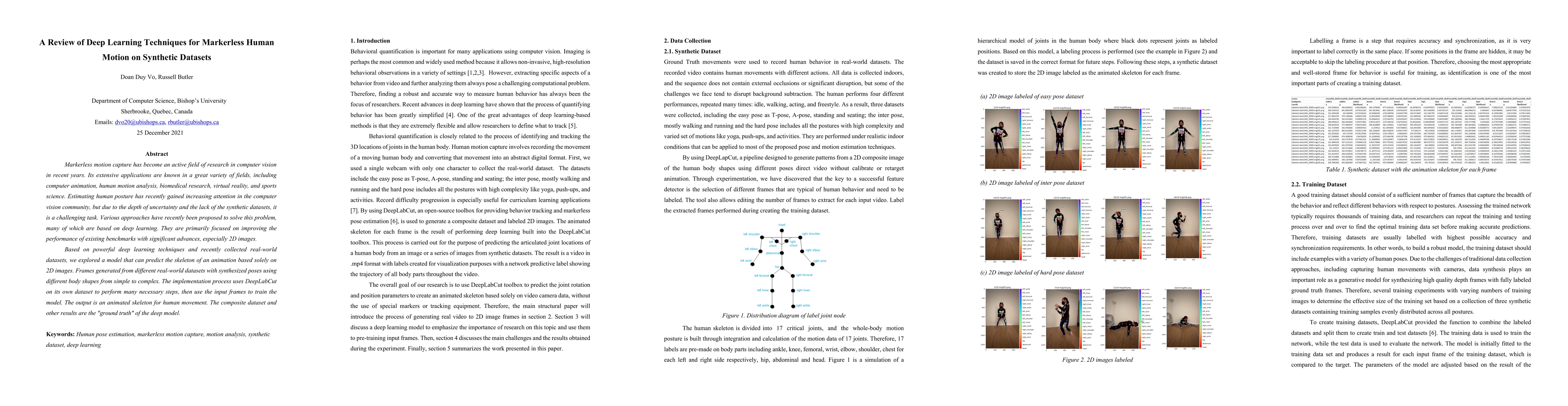This paper reviews deep learning techniques for markerless human motion capture using synthetic datasets, focusing on improving the estimation of human posture from 2D images. The study employs deep learning models, particularly DeepLabCut, to generate animated skeletons from frames, demonstrating significant advances in synthetic dataset-based benchmarks.