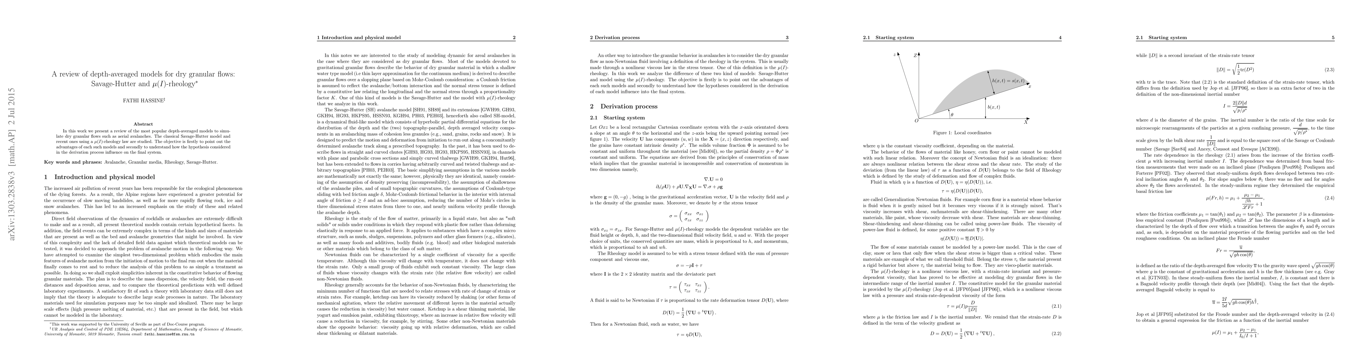 This paper reviews depth-averaged models for simulating dry granular flows, focusing on the Savage-Hutter model and recent $\mu(I)$-rheology approaches. It highlights the benefits of each model and examines how the assumptions in their derivations affect the final system.