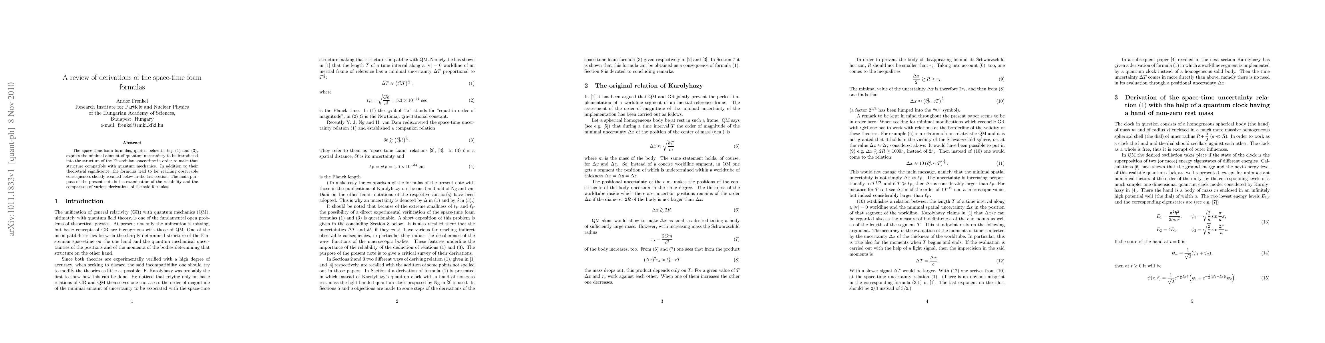 The space-time foam formulas, quoted below in Eqs (1) and (3), express the minimal amount of quantum uncertainty to be introduced into the structure of the Einsteinian space-time in order to make that structure compatible with quantum mechanics. In addition to their theoretical significance, the formulas lead to far reaching observable consequences shortly recalled below in the last section. The main purpose of the present note is the examination of the reliability and the comparison of various derivations of the said formulas.