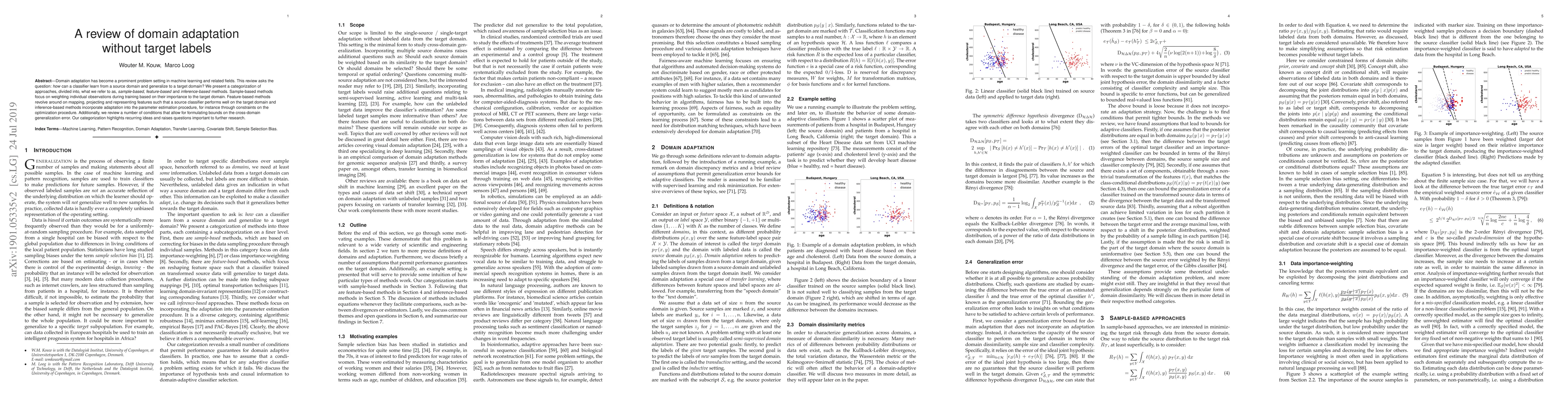 This review categorizes domain adaptation methods into sample-based, feature-based, and inference-based approaches to improve cross-domain generalization. It highlights recurring ideas and raises questions for further research in machine learning.