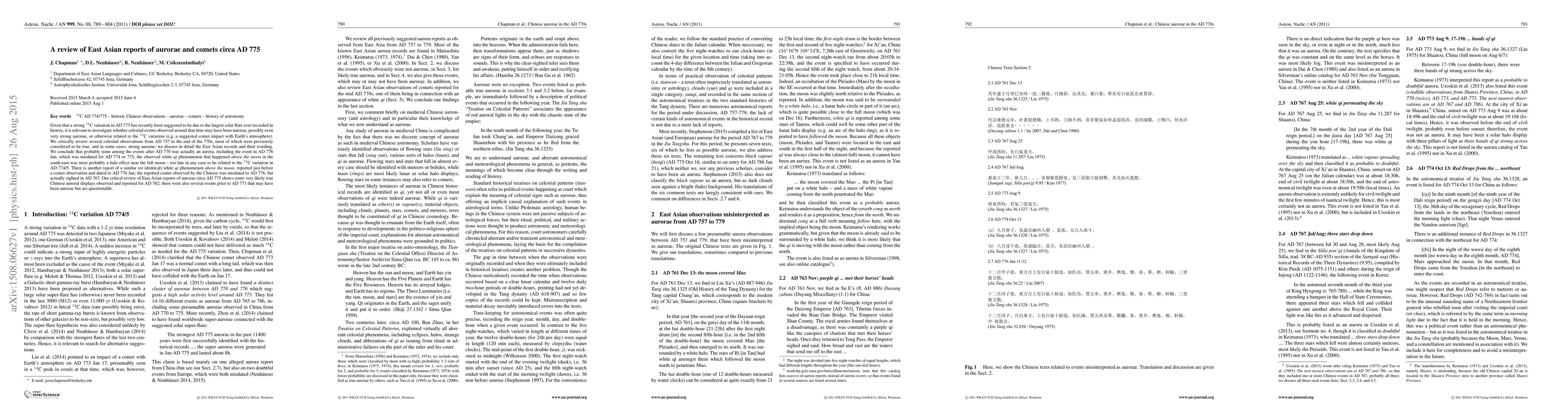 Given that a strong 14C variation in AD 775 has recently been suggested to be due to the largest solar flare ever recorded in history, it is relevant to investigate whether celestial events observed around that time may have been aurorae, possibly even very strong aurorae, or otherwise related to the 14C variation (e.g. a suggested comet impact with Earth's atmosphere). We critically review several celestial observations from AD 757 to the end of the 770s, most of which were previously considered to be true, and in some cases, strong aurorae; we discuss in detail the East Asian records and their wording. We conclude that probably none among the events after AD 770 was actually an aurora, including the event in AD 776 Jan, which was misdated for AD 774 or 775; the observed white qi phenomenon that happened "above the moon" in the south-east was most probably a halo effect near the full moon - too late in any case to be related to the 14C variation in AD 774/5. There is another report of a similar (or identical) white qi phenomenon "above the moon", reported just before a comet observation and dated to AD 776 Jan; the reported comet observed by the Chinese was misdated to AD 776, but actually sighted in AD 767. Our critical review of East Asian reports of aurorae circa AD 775 shows some very likely true Chinese auroral displays observed and reported for AD 762; there were also several events prior to AD 771 that may have been aurorae but are questionable.